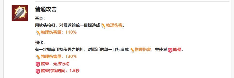 科米的强化状态可持续12秒,相较一般角色6秒的增益时长,优势明显。普通攻击以枕头拍击为主要形式,仅对单一目标生效,无群体打击效果,基础物理伤害为110%。尽管如此,这一数值在同星级角色中仍属上乘。当处于技能强化状态时,她的普攻将升级为“枕头强力拍打”,不仅能造成更高额的物理伤害,还会附加1.5秒的眩晕控制,使敌人无法行动。