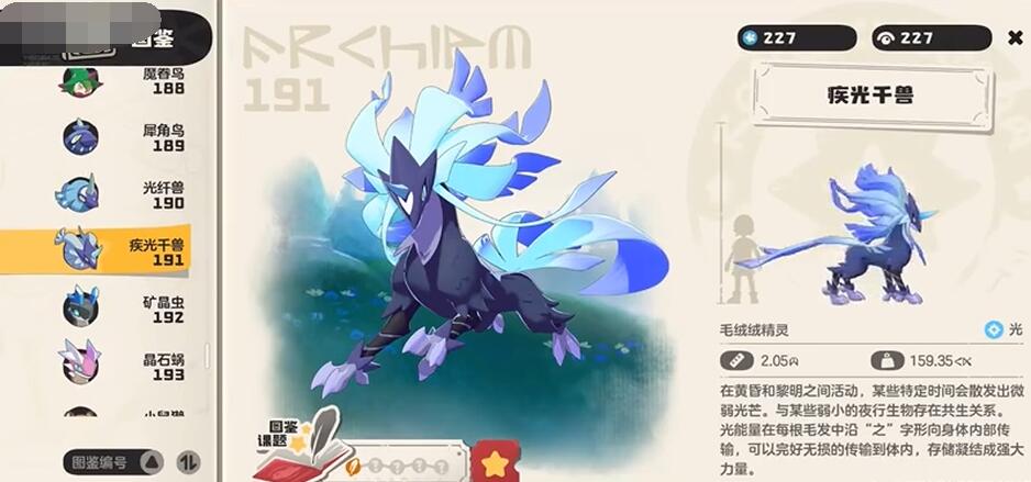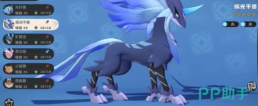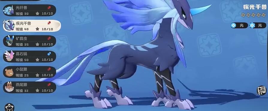 首先就是获取,其实游戏第一阶段测试的时候,月开会送一只疾光千兽,也就是月光队战令解锁,购买战令后需完成周常任务提升战令等级至30级,获得“光系吸引果实”。前往地图“眠枭庇护所”使用果实,概率刷出犀角鸟或光纤兽(推荐抓犀角鸟,进化成本更低)。犀角鸟需投喂“星光蜜露”(活动兑换或者直接氪)进化为光纤兽,再消耗50个“光之结晶”(本里会掉)进化为疾光千兽。若直接抓光纤兽,需准备至少10个高级咕噜球(推荐紫色品质)提升抓捕成功率。