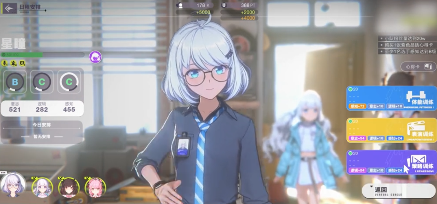在角色成长体系方面,游戏提供了训练规划与活动调度机制,通过合理安排日程可提升偶像的舞台表现力、心理稳定值及基础属性数值。此外,特有的“心得卡”系统将进一步影响技能释放节奏与战术组合方式,增强阵容搭配的策略深度,使每一场对战都充满变数。