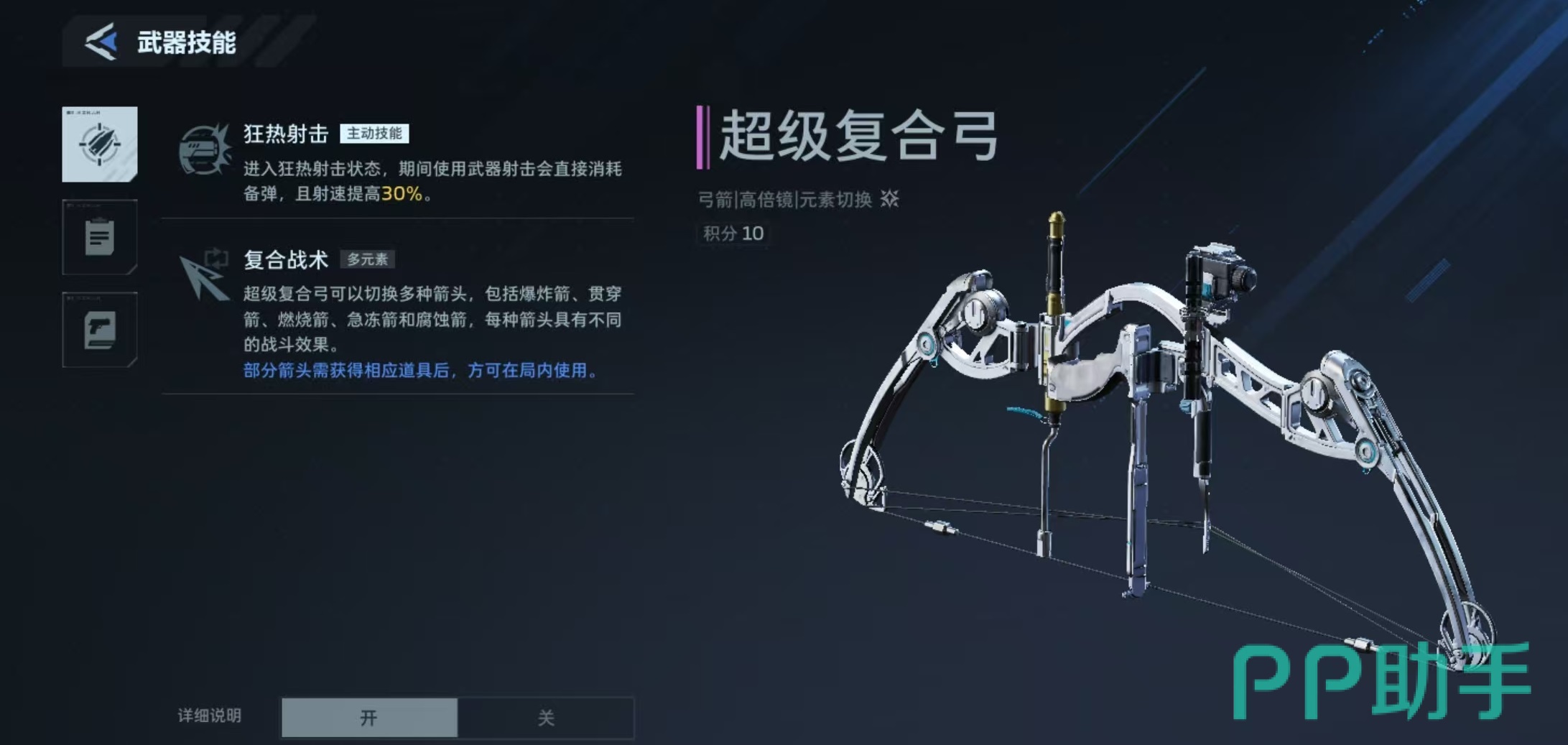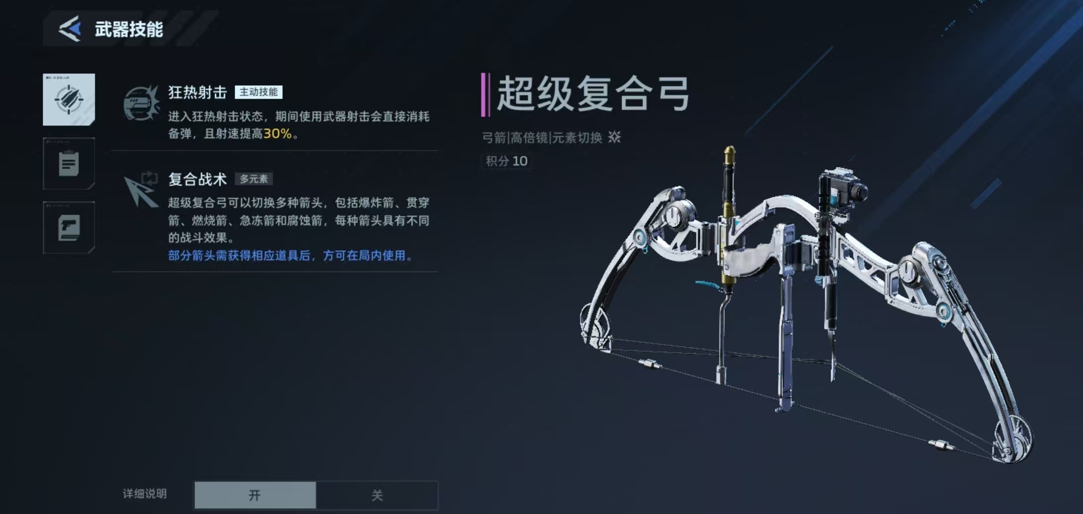 超级复合弓则以模块化战术扩展为核心竞争力。其主动技能“狂热射击状态”开启后,射击将直接消耗备弹,同时射速提升30%。真正体现其战略纵深的是箭头切换系统:支持爆炸箭、贯穿箭等多种功能性箭头自由更换。爆炸箭适用于密集目标区域清场,贯穿箭可实现多目标穿透打击,不同箭头亦可依据主武器类型动态调整,显著提升应对复杂战场环境的灵活性与容错率。
