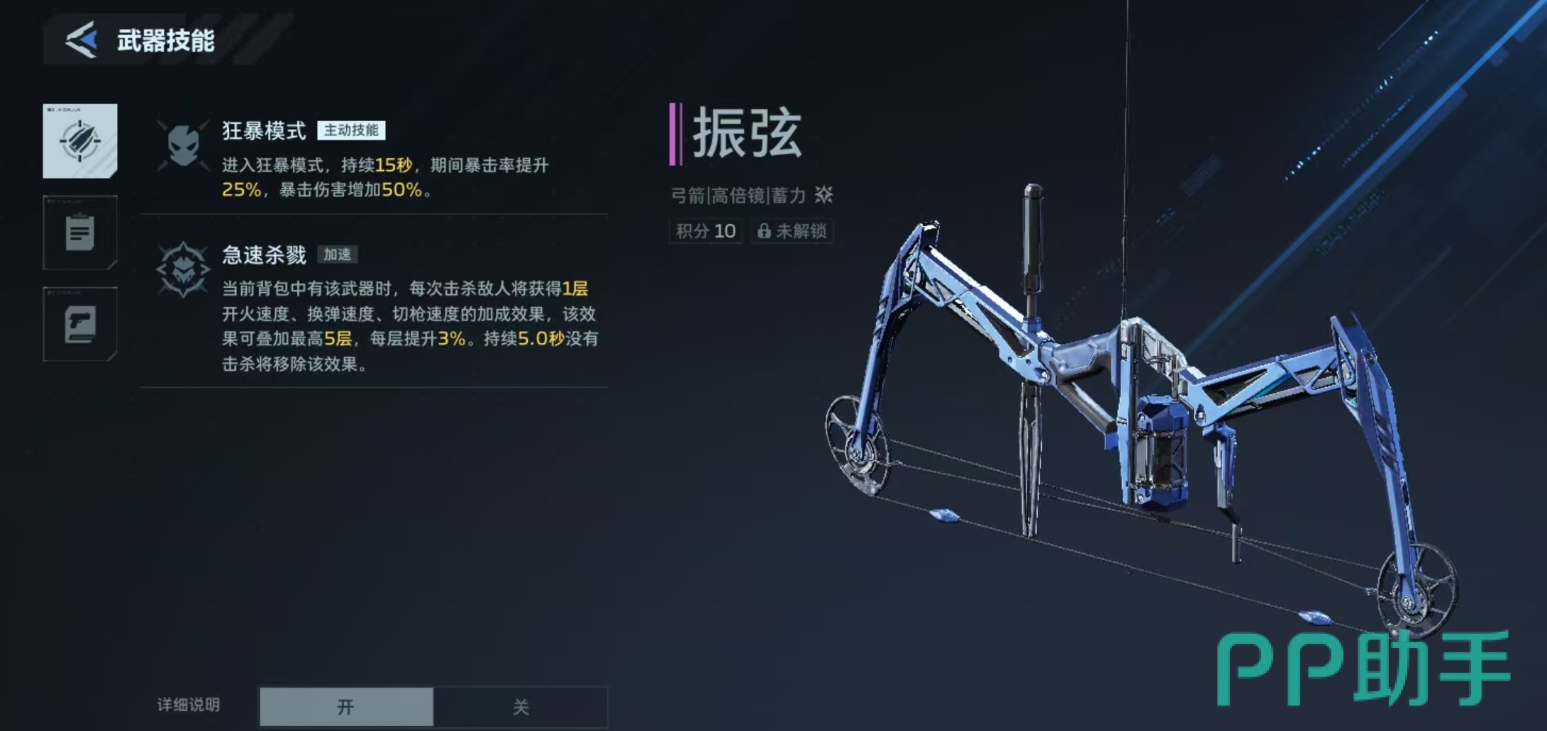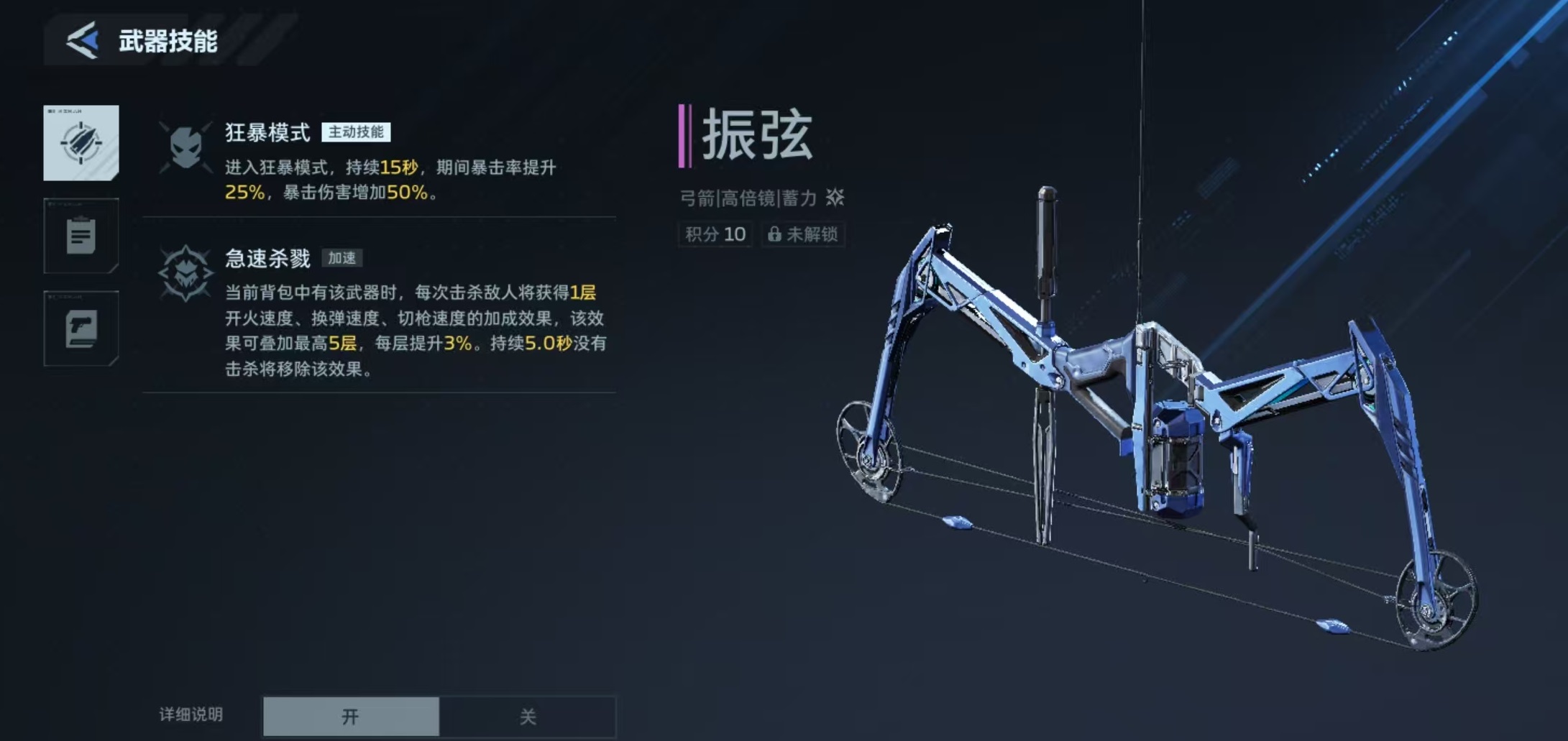 振弦主打持续作战增益体系。其主动技能“狂暴模式”可持续15秒,期间提升25%暴击率与50%暴击伤害,最高可叠加至15%的综合加成。被动效果具备跨武器协同价值:只要该弓存在于背包中,每次击杀即可获得一层增益,覆盖开火速度、换弹速度与切枪速度三项关键操作指标;若5.0秒内未达成新击杀,则自动清除该层效果。这意味着即使不实际使用振弦,它也能作为后台辅助工具,悄然强化主武器的节奏表现。