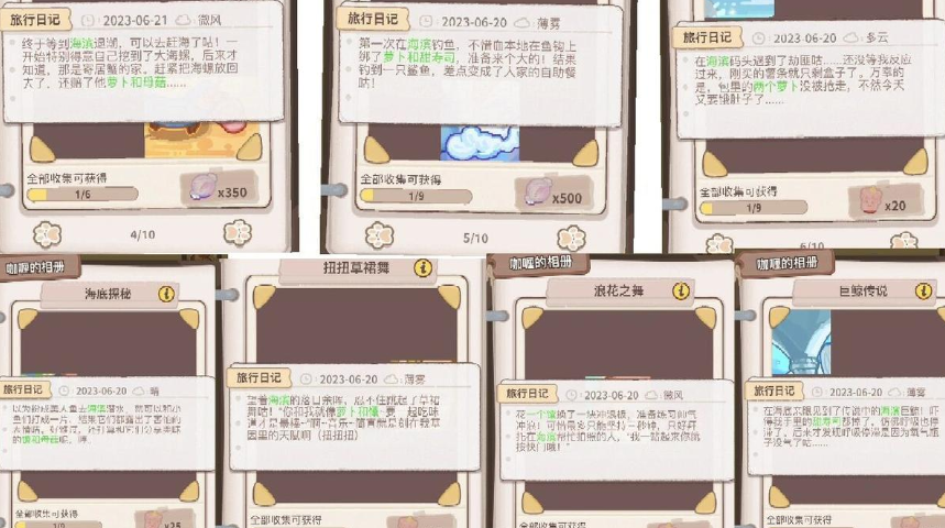 最后两个任务分别是浪花之舞和巨鲸传说,玩家分别准备好馕和甜寿司即可,如果玩家达成了全收集,则可以解锁扭扭草裙舞的相关任务内容,玩家要提前准备好萝卜和馕,再将这些食物分发给客人之后,玩家就彻底完成了海滨地图上的所有任务,不仅能够获得海滨的徽章才能够获得海滨成就。