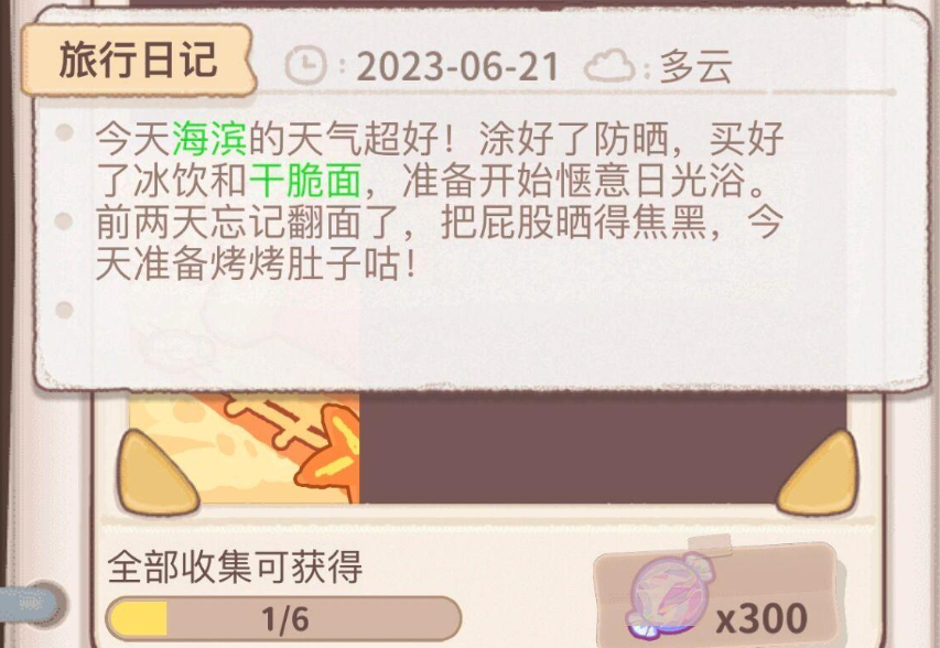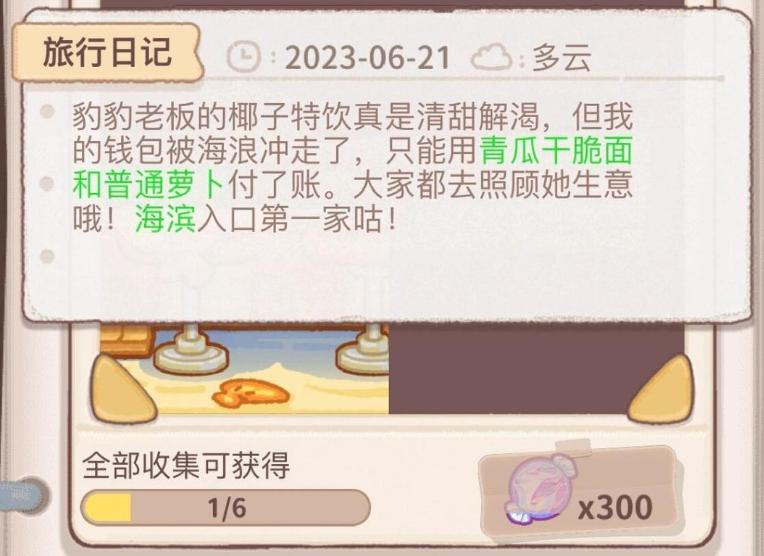 在海滨地图的第一天,游戏会要求玩家制作海滨椰饮,玩家需要在海滨摘取椰子,从而带回到餐厅之中,本次制作海滨椰饮需要消耗干脆面和胡萝卜,随后玩家会被要求制作阳光烤鸡,游戏会提供给玩家基础的食物料理,玩家只需要增加干脆面即可,随后兜风小摩托这个支线任务需要玩家给予来海边畅玩的小伙伴们制作美食,此时玩家给佐料增加萝卜即可,在赶海日的时候,玩家需要携带上萝卜和蘑菇帮助渔民烤鱼。