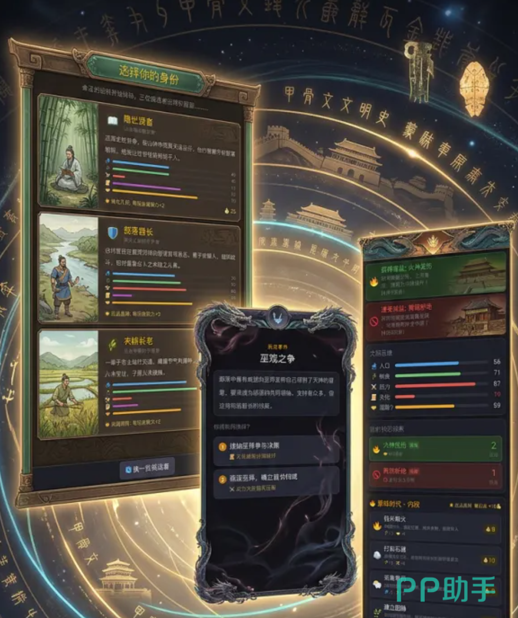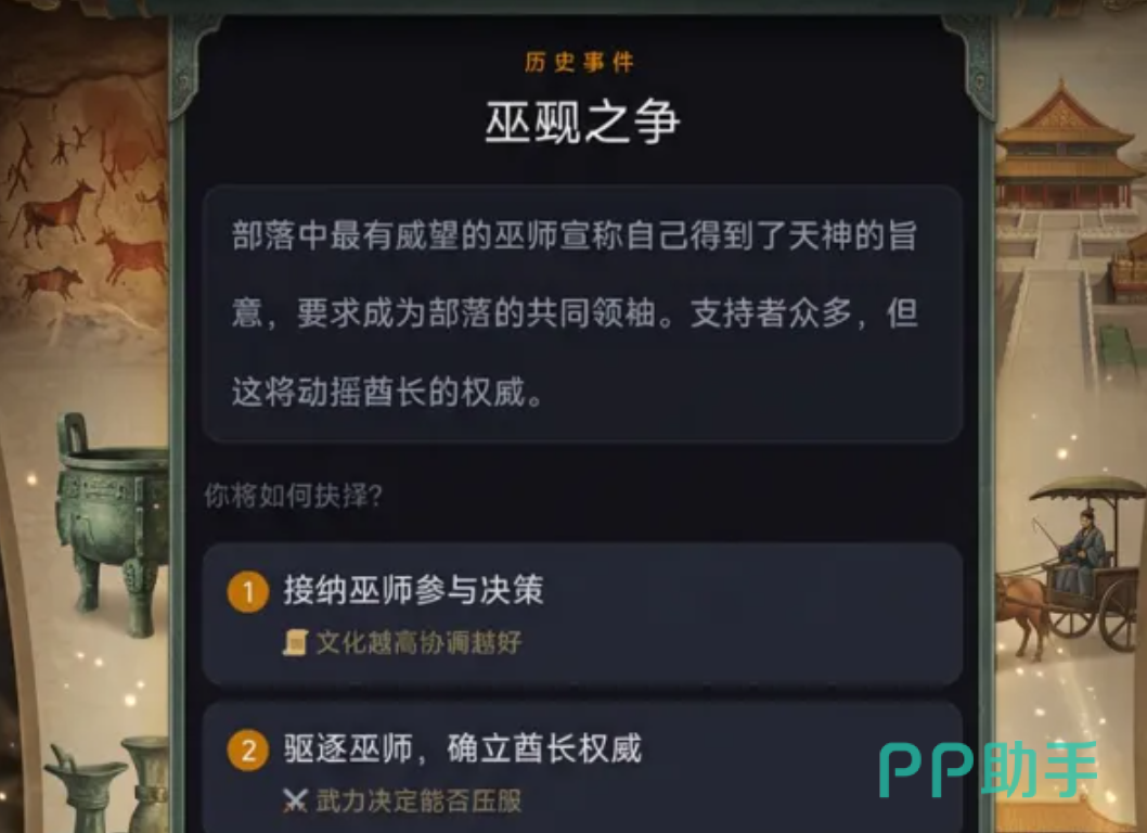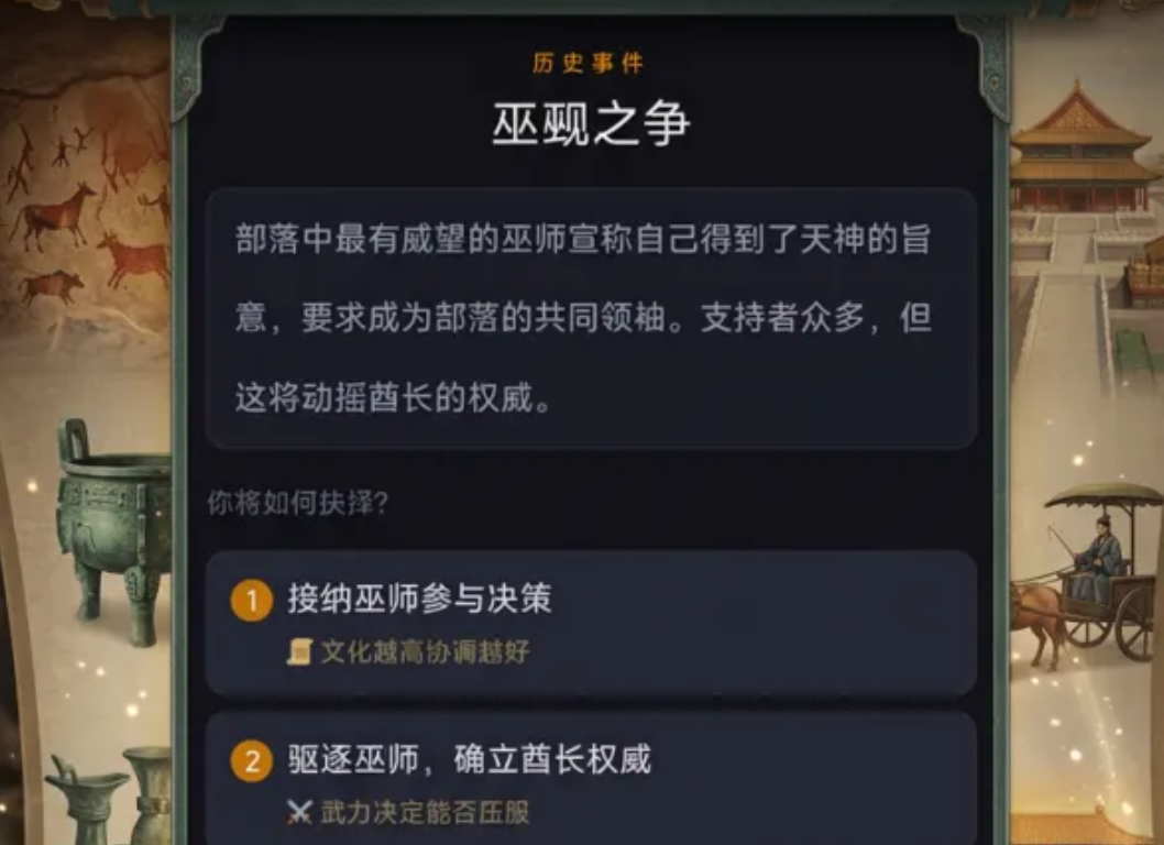 游戏核心围绕五大文明指标展开:人口、粮食、武力、文化、凝聚力。任一维度归零即宣告文明终结,倒逼玩家建立动态平衡模型。历史事件系统深度还原关键节点,如长老制存废争议、巫觋权力博弈、治水方略抉择等,每个选项均附带即时反馈与长线影响。增益与减益效果(如火神庇佑、商路断绝)构成策略纵深,需结合时代特征精准调用,方能推动文明稳健跃迁。