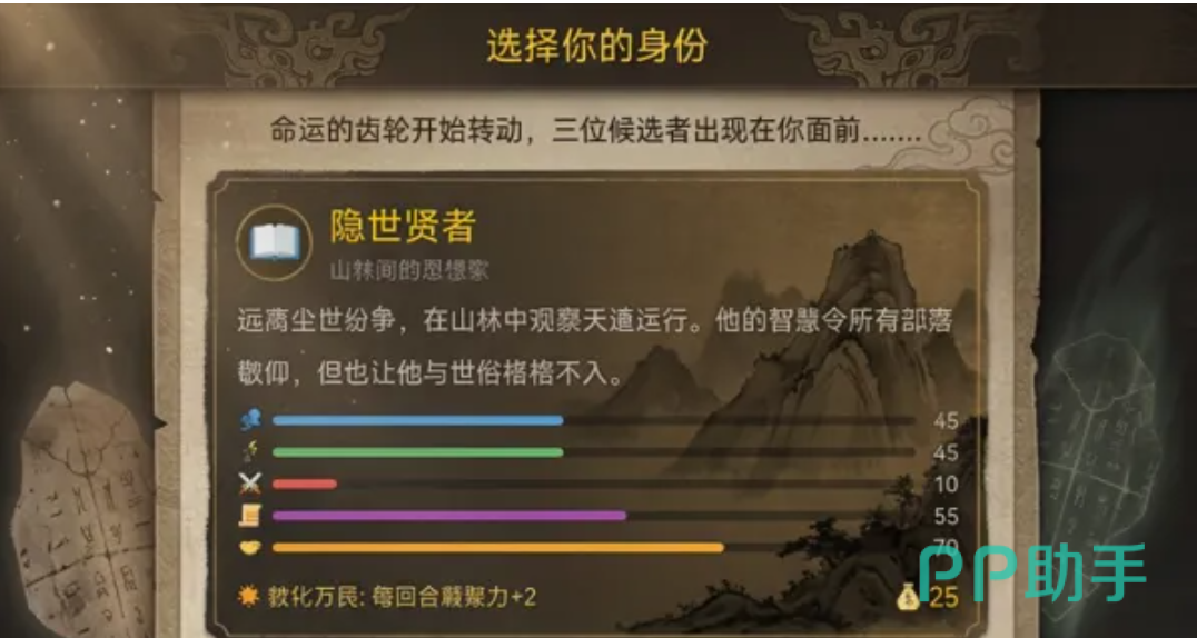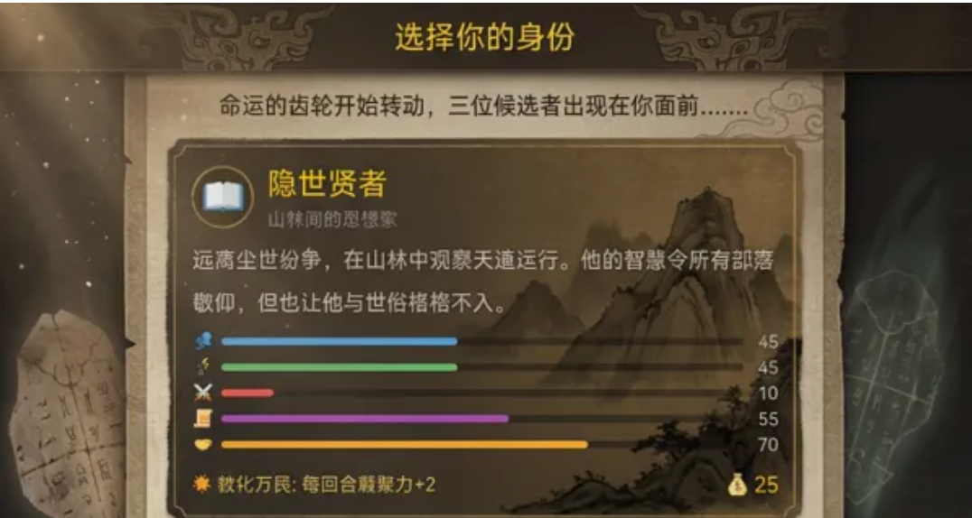 本作采用多维角色驱动机制,开局可选战族勇士、隐世贤者、大巫祝、部落酋长、农耕长老、行商首领六大初始身份。每位角色拥有专属起始属性与时代特技,直接影响资源获取节奏、事件触发倾向与发展路径走向,确保每局游戏均具备高度不可复现性。决策链深度嵌套于文明演进全过程——小至一次祭祀仪式的取舍,大至制度变革的推行时机,皆牵一发而动全身。