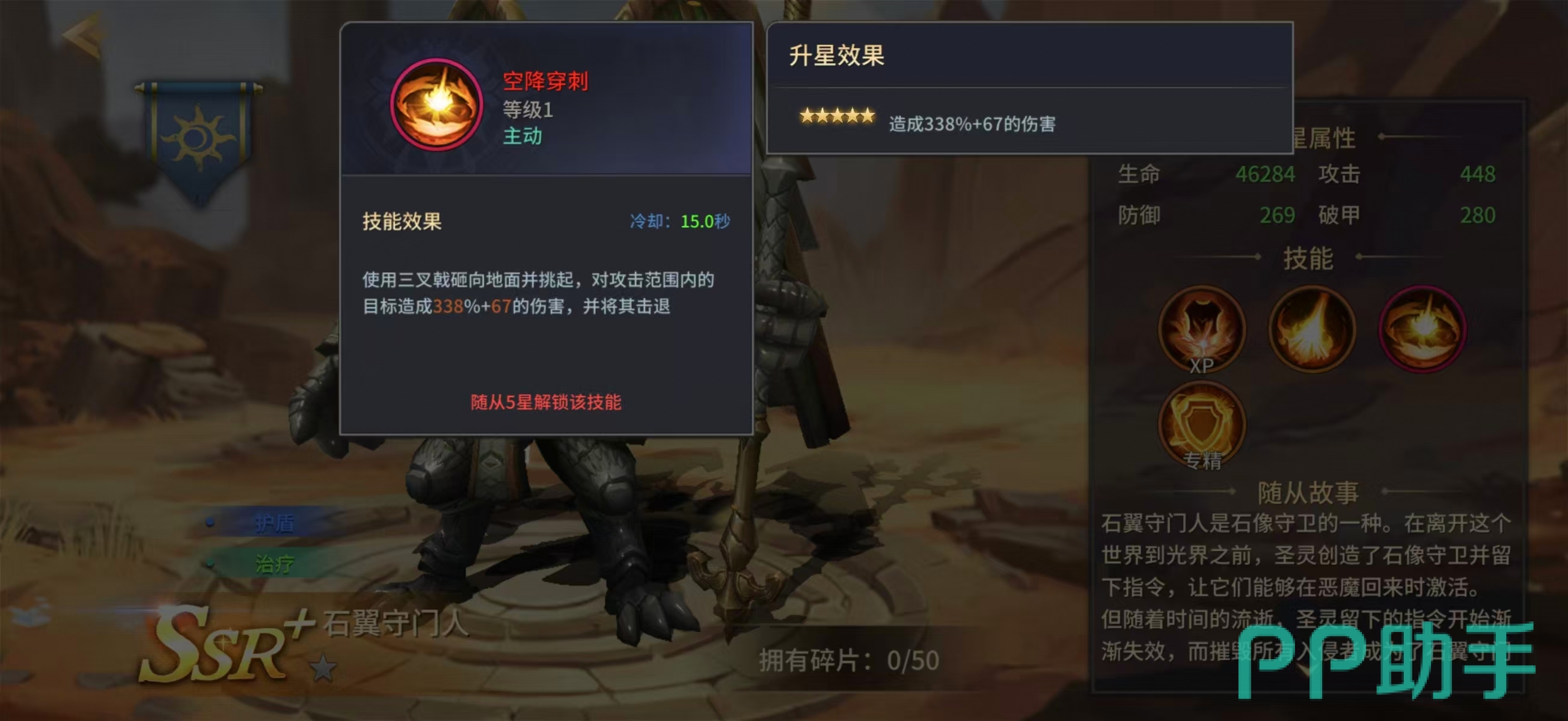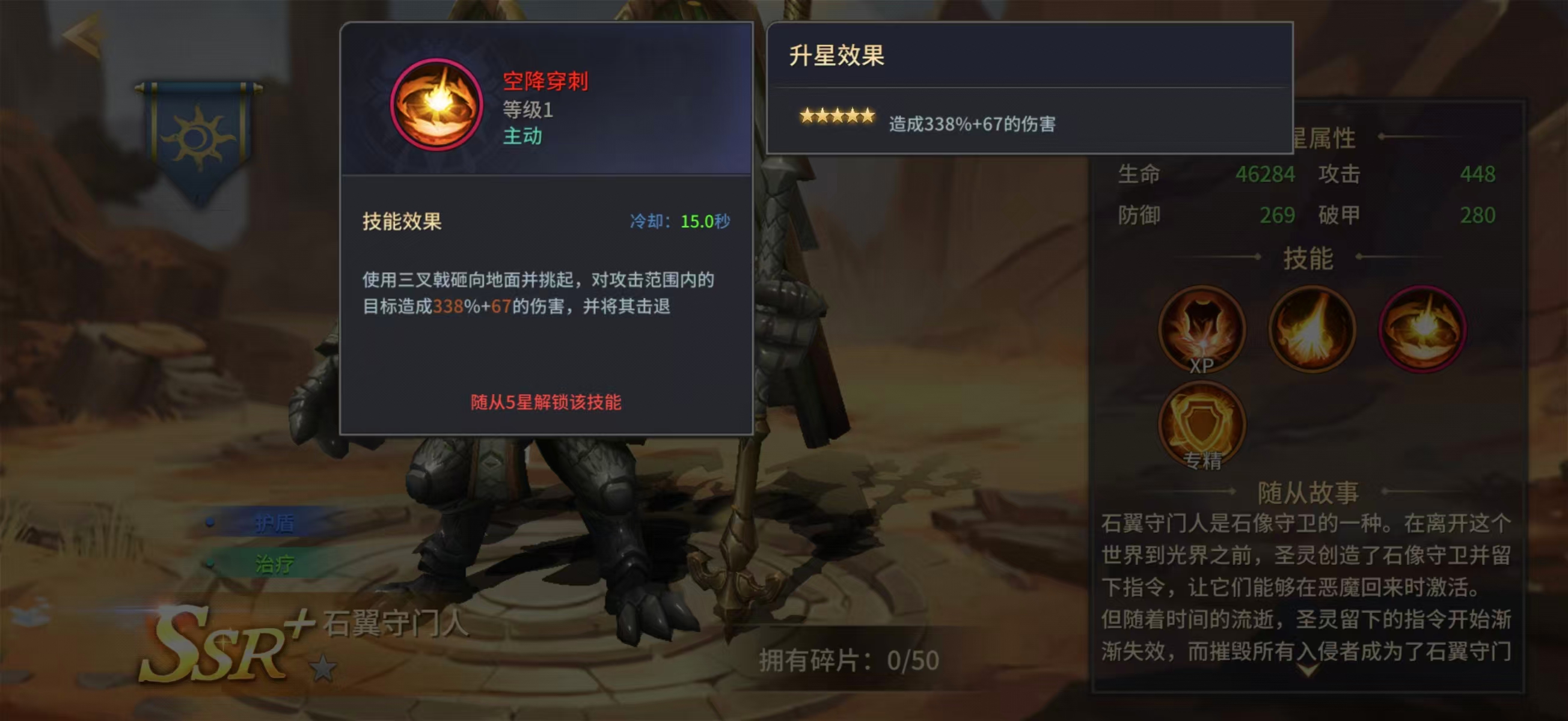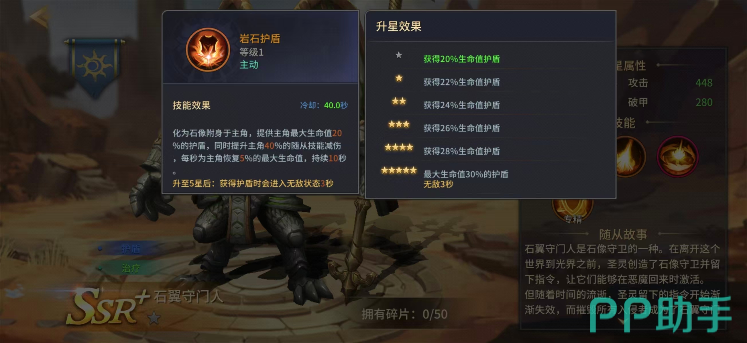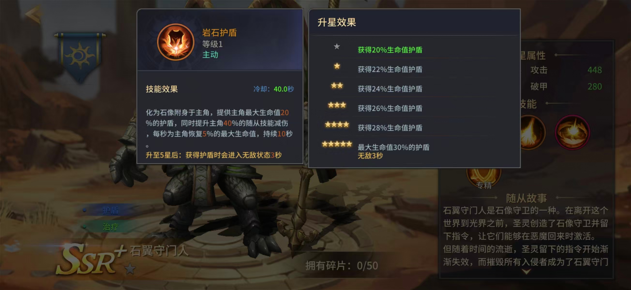 技能体系围绕“护盾—减伤—恢复—无敌”四重生存维度展开:一技能【石刃攻击】除基础伤害外,附带20%概率为主角生成岩石护盾,吸收相当于其最大生命值5%的伤害;二技能【空降穿刺】以三叉戟轰击地面,对范围内敌人造成伤害并施加击退效果,兼顾控制与范围压制;核心大招则激活【石像附体】状态——立即为主角提供相当于其最大生命值20%的护盾,并提升其随从技能所触发减伤效果40%,同时每秒恢复主角5%最大生命值。当伙伴升星后,每次成功生成护盾还将额外赋予3秒无敌状态。这一机制使其在竞技场反杀、BOSS战关键帧规避、试炼之塔高压关卡等场景中具备不可替代的战略价值。