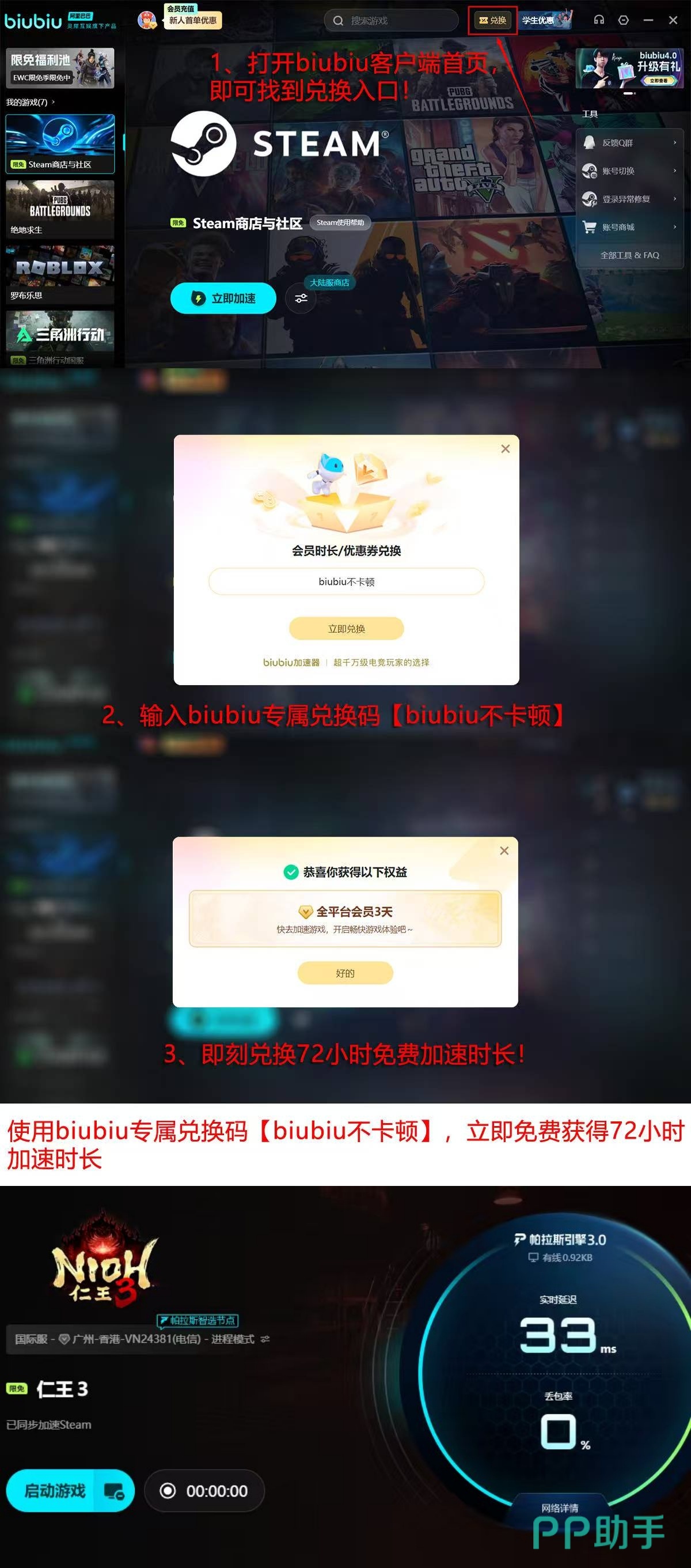 针对用户关注的使用成本问题,当前新注册用户可直接领取24小时免费加速时长;另输入专属口令【biubiu不卡顿】,还可额外激活72小时体验权限。两项权益叠加后,总计可获得96小时无限制加速服务,覆盖完整新手引导及主线初期流程。