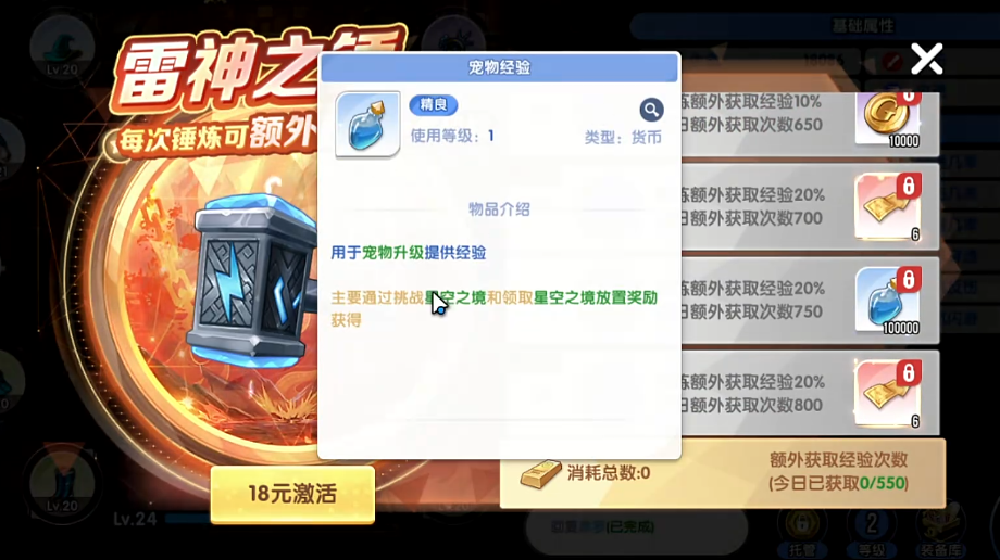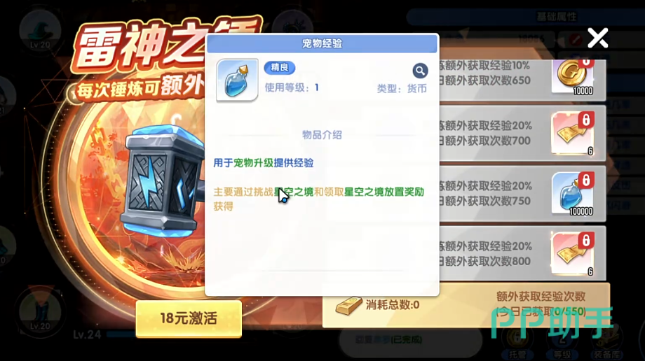 3、使用道具“雷神之锤”——该道具具备双重产出机制:一方面用于铁匠铺经验积累,另一方面在累计使用达到指定阈值后,触发额外奖励结算,其中稳定包含一定数量的宠物经验道具。属于资源复用型养成手段,建议搭配铁匠铺升级节奏同步使用。