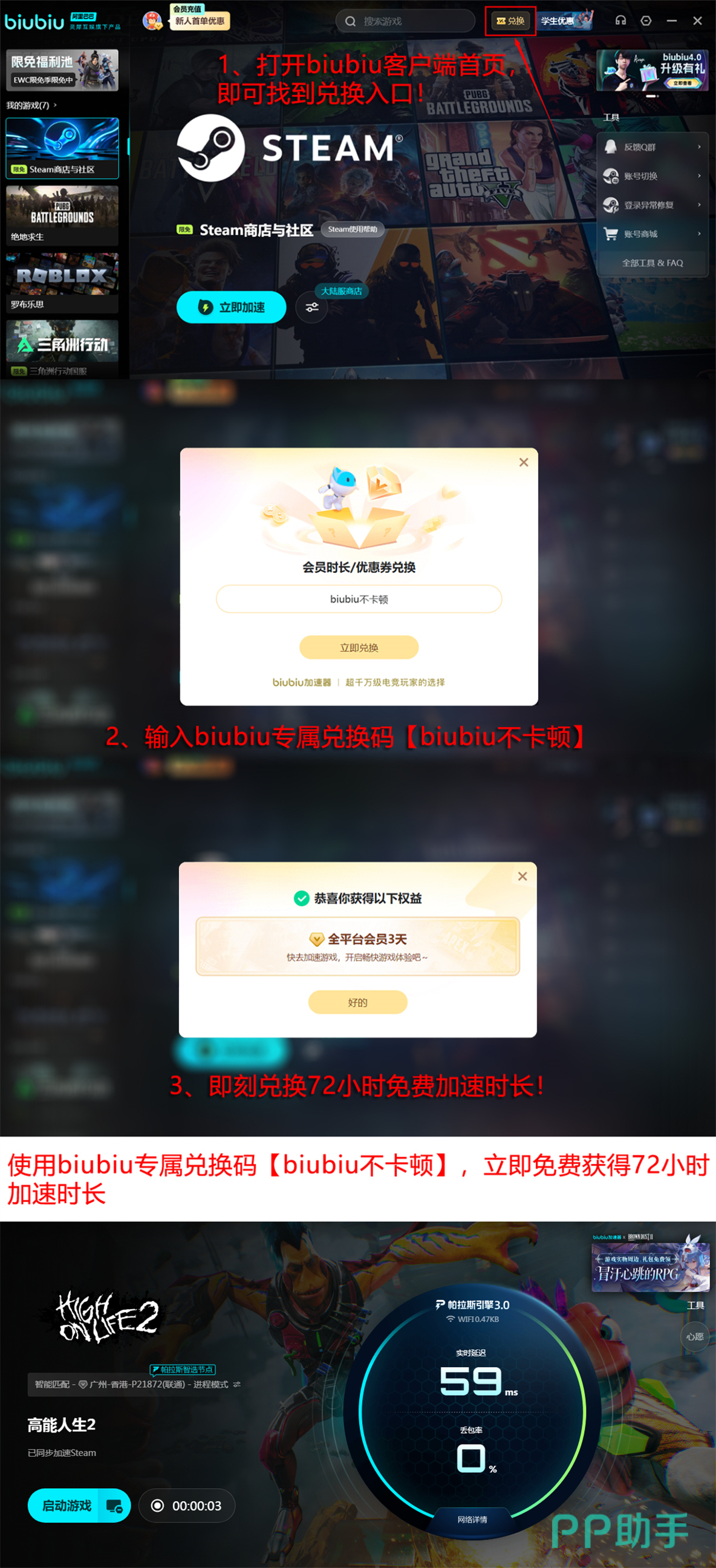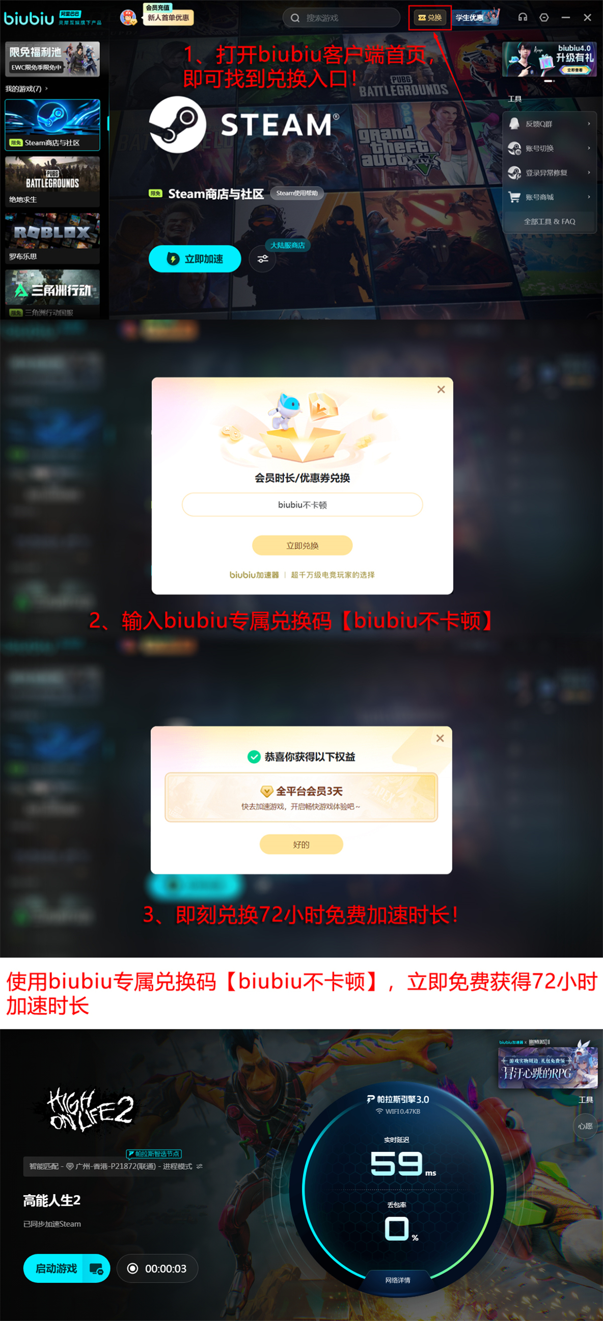 新用户注册后即可领取24小时免费加速时长,无需付费即可完成首测验证;另可输入兑换码【biubiu不卡顿】,每位账号额外激活72小时加速权限,合计享96小时零门槛试用期。