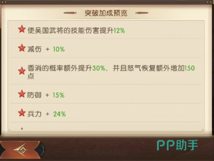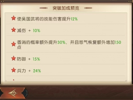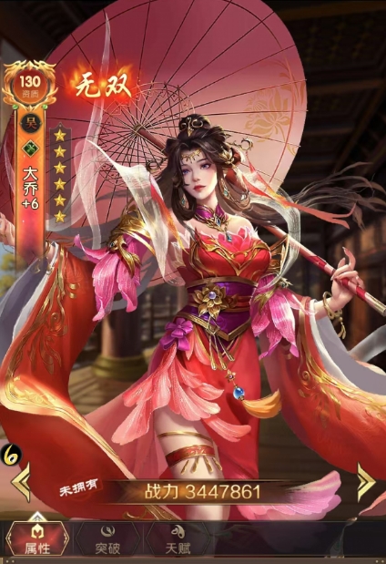 大乔突破之后会获得一系列强大的属性增益效果,她能够使吴国武将的技能伤害提升12%,团队中的效果就是可以同步增强吴国武将的输出能力,同时大乔还会为吴国武将带来大减伤 +10%的效果,这有助于提高武将在战场上的生存能力,减少所受伤害,使其能够在激烈的战斗中持续更久的时间,稳定地发挥输出与辅助作用,香消技能也会因大乔的突破而得到强化,其触发概率额外提升 30%,这意味着在战斗中该技能能够更频繁地生效,为队友驱散负面状态并提供怒气恢复,而且怒气恢复量还会额外增加 150 点,进一步增强了团队的续航能力。