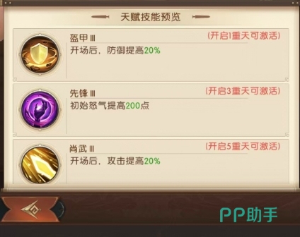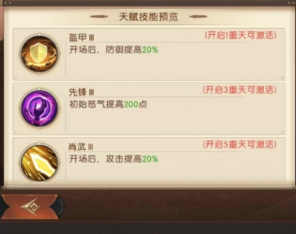 先锋天赋技能需要在开启 3重天时才能激活,一旦激活,大乔的初始怒气会提高 200 点,这使得她在战斗开始时就能够更快地释放技能,尚武天赋技能则要求开启 5重天方可激活,激活后在开场时攻击提高 20%,提升大乔自身的输出能力,在一些特定的战斗场景中,如某些副本的特定波次怪物或者玩家对战中的残局阶段,大乔也能够利用自身攻击力的提升对敌方造成可观的伤害。