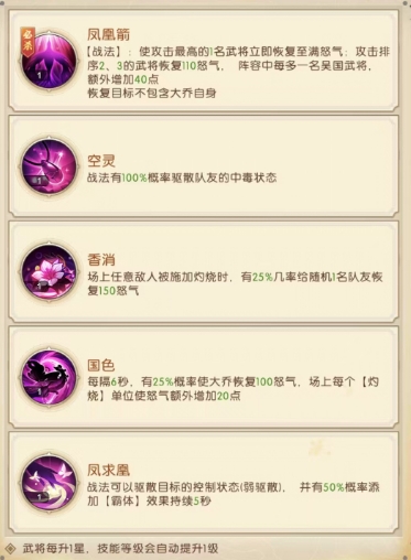 大乔她所具备的技能凤凰箭有着独特的战法机制,此战法能够针对战场上攻击最高的那一名武将,让其瞬间恢复至满怒气状态,而对于攻击排序处于第二、第三位的武将,则可恢复110点怒气,并且随着阵容中吴国武将数量的增加,每多一名吴国武将,就会为该技能的恢复效果额外增加 40 点怒气,不过需要注意的是这里的恢复目标并不包含大乔自身。