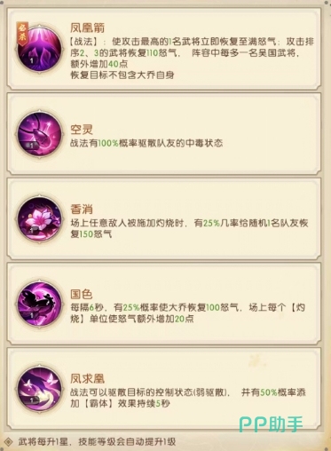 国色技能会每隔 6秒启动一次,有25%的概率使大乔自身恢复 100点怒气,同时,场上每存在一个灼烧单位,大乔的怒气恢复量还会额外增加 20 点,这使得大乔在持久战中能够保持稳定的怒气供应,持续发挥其辅助作用,最后的凤求凰技能效果更是独特,其战法不仅可以驱散目标的控制状态,实现弱驱散的效果,而且还有 50%的概率为目标添加霸体效果,并且此霸体效果能够持续 5 秒,这一技能在面对敌方的控制技能时,能够有效地保护己方关键武将,使其不受控制干扰。