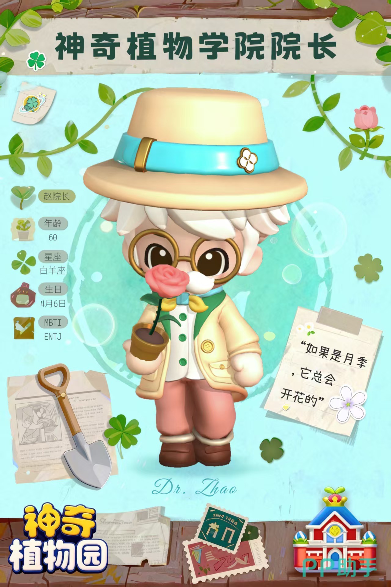 赵院长是“神奇植物学院”的现任负责人,被玩家普遍视为游戏世界的稳定锚点与精神向导。其视觉设计融合知性与亲和力:标志性圆框大眼镜、高耸礼帽搭配环绕式蓝色丝带,精准传递出学术权威与人文温度并存的形象特质。生日设定为4月6日,对应白羊座,契合其行动力强、情绪饱满、富有感染力的性格内核。那句广为流传的台词——“如果是月季,它总会开花”,既是植物学常识的诗意转译,也暗喻成长过程中的耐心与信念。