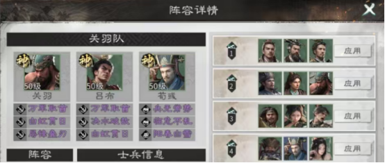 阵容协同机制强调站位与兵种联动:吕布、荀彧、关羽(或张飞)均建议部署于追击格位,以高频触发吕布天赋追击效果;士兵配置推荐前三排全部布设铁骑兵种,在保障稳定高伤输出的同时,兼顾中等承伤能力,契合该队“快打稳守”的战术定位。三名武将各司其职——吕布主攻、张飞/关羽控场与辅助、荀彧全局增益,共同构建起兼具爆发力、续航性与战术弹性的铁三角体系。