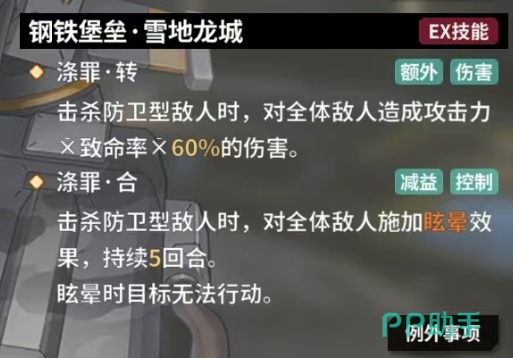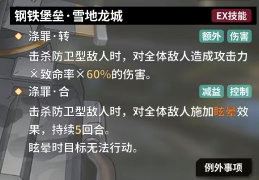 EX技能钢铁堡垒雪地龙城更是展现了强大的群体伤害能力,当成功击杀防卫型敌人时,它会瞬间引发一场爆炸,对全体敌人造成基于攻击力、致命率以及 60%系数的高额伤害,够覆盖整个战场,涤罪·合则赋予了拥有者一种独特的控制能力,当成功击杀防卫型敌人时,它能够对全体敌人施加眩晕效果,这一效果的持续时间长达5回合,在这5回合的时间里,被眩晕的敌人将陷入一种无法行动的状态,例外事项中强调了这一技能能够无视一级免疫,涤罪·转技能同样是在击杀防卫型敌人时触发,它能够再次对全体敌人造成攻击力、致命率以及 60%系数的伤害。这一重复的伤害输出机制与钢铁堡垒·雪地龙城技能相辅相成。