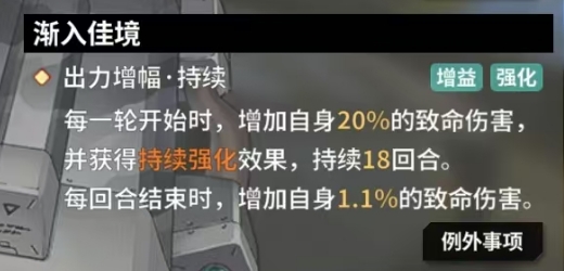 渐入佳境技能则是在觉醒的时刻解锁,其中的出力增幅持续效果更是为拥有者带来了前所未有的战斗助力,每一轮战斗开始时,它都能为拥有者增加自身 10%的致命伤害,同时它还伴随着持续强化效果,这种效果是能够稳定地持续18回合,在每回合结束时,拥有者的致命伤害还会额外增加0.5%,随着战斗回合的不断推进,这种伤害加成会逐渐积累,满级属性下的出力增幅持续技能更是将输出能力推向了极致,每一轮开始时它能使拥有者获得高达20%的致命伤害提升,而每回合结束时,致命的伤害又会进一步提升 1.1%,这种持续且稳定的伤害增长机制使得拥有者在持久战中占据绝对的优势。