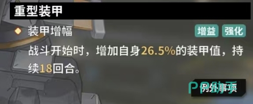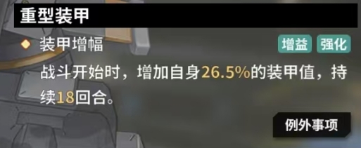 重型装甲技能为拥有者带来了强大的装甲增幅效果,此技能激活赋会予自身高达18.5%的装甲值提升,且这种装甲增幅效果并非转瞬即逝,它将稳稳地持续 10回合之久,例外事项中明确指出,这一独特的技能无法被复制与掠夺,满级属性下,重型装甲技能进一步得到了升华,进化成为更为强大的装甲增幅技能,战斗开始时它能够将自身的装甲值大幅提升26.5%,更为重要的是这次的装甲增幅效果持续时间延长至18回合,几乎贯穿了整个战斗过程。
