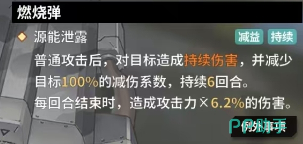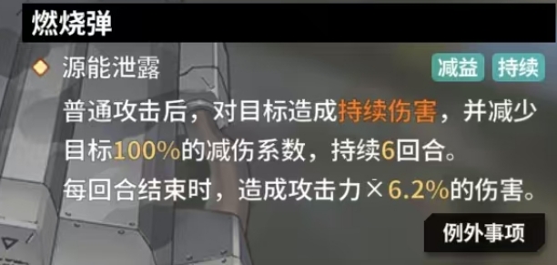 叶芙根尼娅的技能目标范围具有独特的优先选择机制,她会精准地将攻击目标锁定为同排的第二名敌人,这一策略性的选择使得她在战场上能够巧妙地突破敌方防线,直击关键目标,其核心技能之一燃烧弹,展现出了强大的源能泄露效果,当叶芙根尼娅发动普通攻击后,这颗燃烧弹不仅会对目标造成初始伤害,还会引发一系列后续效应,在接下来的6回合内,目标会持续承受伤害,并且每回合结束时,会遭受相当于叶芙根尼娅攻击力 4.2%的伤害。