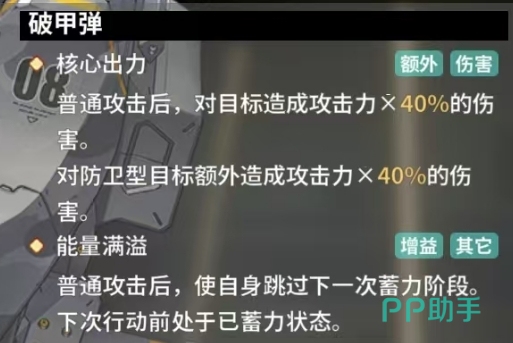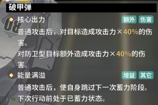 破甲弹作为叶芙根尼娅的又一强力技能,其核心出力不容小觑,普通攻击后它能够瞬间对目标造成相当于叶芙根尼娅攻击力 20%的伤害,尤其面对防卫型目标时,破甲弹更是展现出了其独特的优势,会额外造成同样相当于攻击力 20%的高额伤害,能量满溢则赋予了叶芙根尼娅普通攻击后,叶芙根尼娅能够巧妙地使自身跳过下一次蓄力阶段,从而在下次行动前处于已蓄力状态,这一技能特性使得她在战场上能够更加迅速地连续发动攻击,满级属性下的能量满溢技能进一步强化了叶芙根尼娅的战斗效能,普通攻击后她不仅能够跳过下一次蓄力阶段,还能在更短的时间内迅速恢复并进入下一次攻击的准备状态。