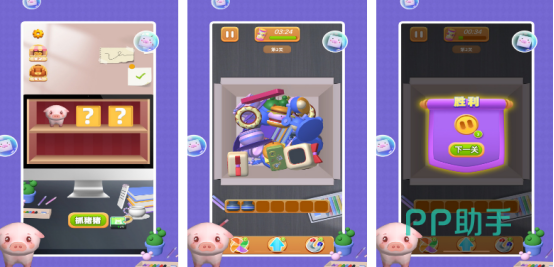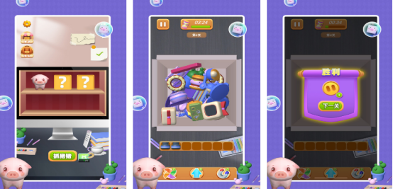 治愈性极强的画风,再搭配上经典的三消玩法,会给玩家带来无尽的解压感。您在开局后将会看到错综复杂的物品随意地摆放在一个箱子中,玩家要通过合理寻找仔细观察的方式,将相同的三个元素物品,放在下方的方块格中就能快速消除,只要在规定的时间之内,将每个关卡中所有的元素全部消除即可顺利闯关。