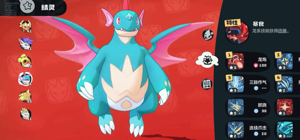 为了让协同效果生效,同样需要让翼龙学会热身运动、三鼓作气和乘胜追击这三个技能。这样在实战中,两只翼系精灵可以交替叠加增益状态,形成连续爆发输出。但由于技能连发会大量消耗能量,必须配备一名能够提供能量支持的辅助精灵。推荐选择水系精灵圆号鱼,并为其配置湿润印记技能。