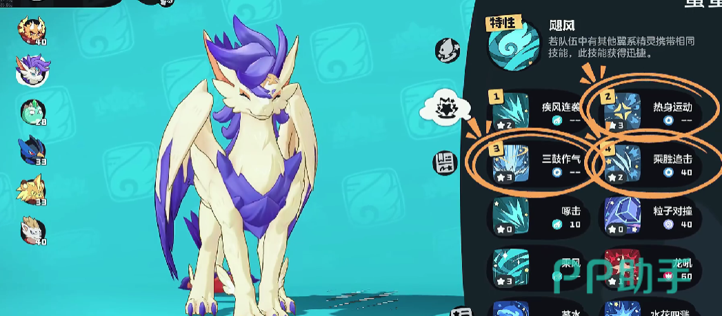 当这三个技能全部获取后,建议按照“热身运动→三鼓作气→乘胜追击”的顺序依次学习。完成学习后,注意查看翼王的特性机制:当队伍中存在其他携带相同技能的翼系精灵时,对应技能可触发迅捷效果。因此,在构建热身连击流阵容时,除了翼王外,还需搭配另一只翼系精灵——翼龙,以最大化连击效率。