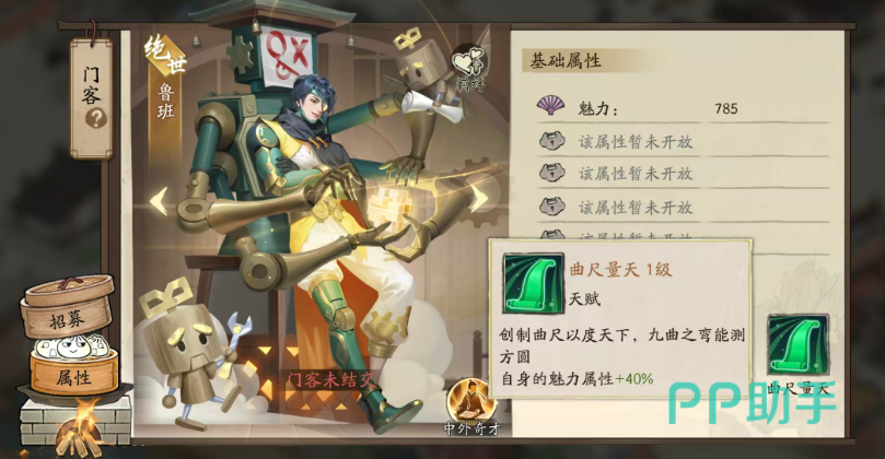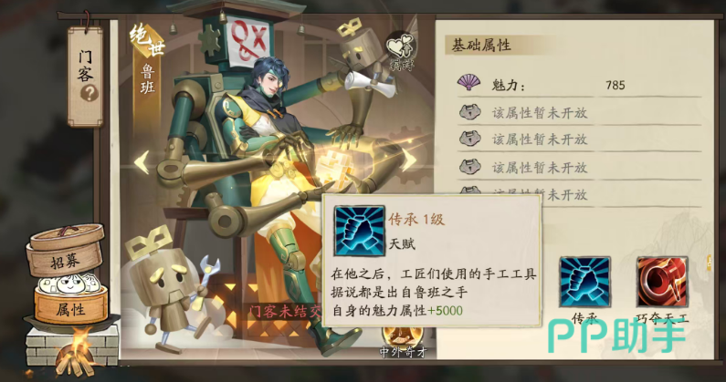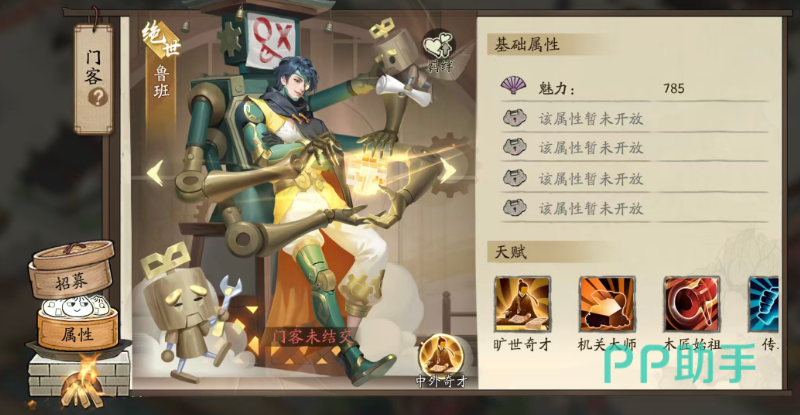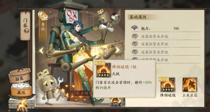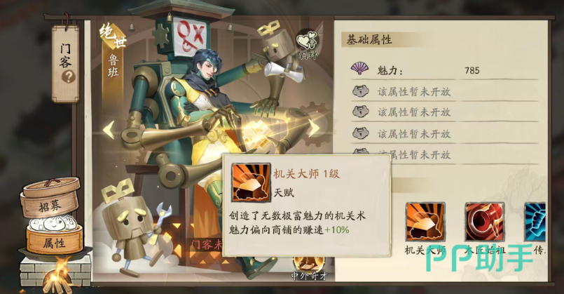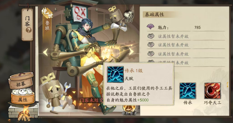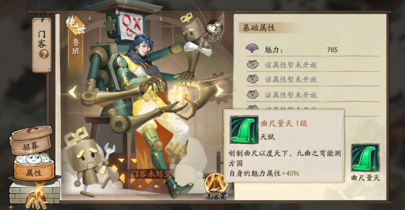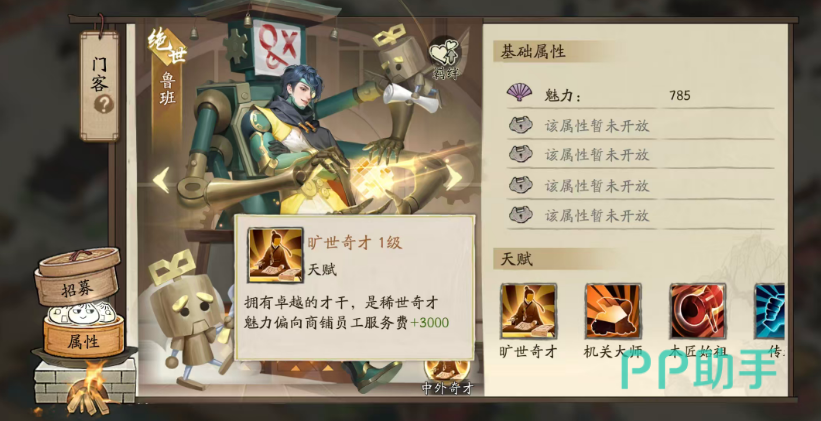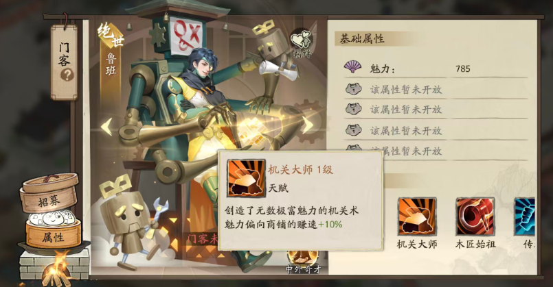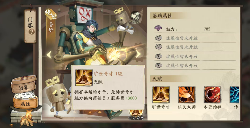 鲁班无法通过常规招募获取,仅限于限时活动“中外奇才”扭蛋池中抽取。由于其绝世品质定位,获取难度高于普通及珍稀门客。但其初始魅力属性显著优于同阶角色,为后续天赋叠加提供坚实基础。首推天赋【旷世奇载】可使商铺员工服务费固定提升3000点,该效果直接作用于每单结算环节,对高频低额交易型店铺(如杂货铺、茶馆)尤为实用。建议优先将其部署于员工位;若岗位已满,则可替代至店长位,确保核心加成生效。