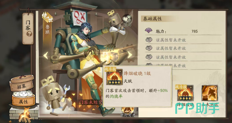 【传承】天赋聚焦属性质变:每次使用手工类工具操作时,额外赋予5000点魅力值固定加成。结合其初始魅力基数,满配状态下基础魅力可稳定突破6000点,大幅优化商铺升级所需资源消耗效率。而终极天赋【巧夺天工】则实现爆发式跃升——单次激活即可获得10000点魅力值增益,使其在绝世门客梯队中属性维度遥遥领先。若鲁班参与战斗场景,推荐搭配战斗机向天赋链,例如【烽火破晓】:首次攻击首领单位时,灼伤概率提升50%,专精于Boss战等高难度挑战。