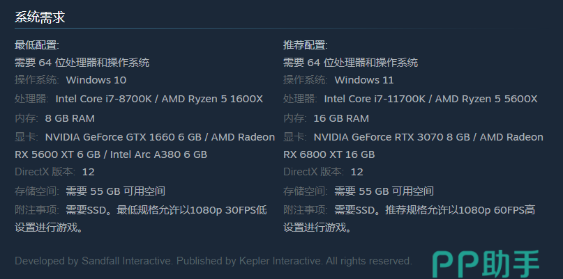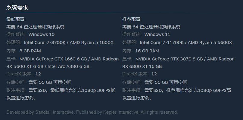 《光与影:33号远征队》作为一款采用虚幻5引擎打造的次世代JRPG,其配置要求属于中等偏高,对硬件性能的优化较为合理。