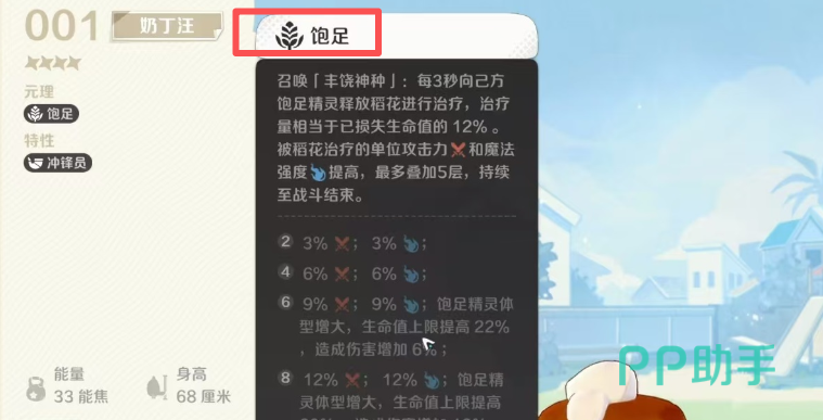 “饱足”是一项具有成长性的后期属性,可召唤丰饶神协助作战。每隔三秒,丰饶神会对己方拥有饱足状态的精灵进行一次治疗。经过治疗后,该精灵不仅体型会增大,生命上限和造成的伤害也会随之提升。