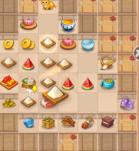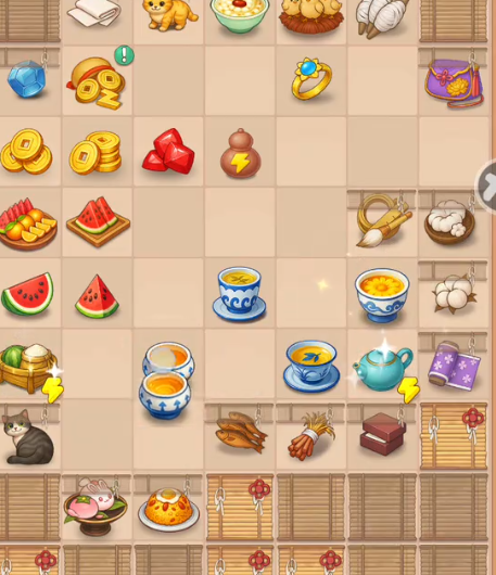初步装修完成后,便可通过接待客人来获取铜币收入。接待过程即为消除玩法的具体体现:通过连续合成低级材料,最终制作出顾客指定的物品,交付后即可获得奖励。前期顾客需求较为简单,人数也较少,旨在帮助玩家平稳过渡到核心玩法。完成一系列任务后,触发新的剧情——前世的夫君突然现身,企图夺取茶楼所有权。主角果断反击将其驱逐,事件结束后茶楼自动升至2级。