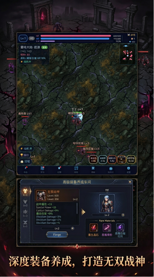 装备体系设计强调公平性与自由度:全装备无绑定限制,可通过副本掉落、任务奖励、挂机收益等多种途径获取;支持玩家间自由交易流通;多余装备可投入熔炼系统,转化为升级资源,适配不同职业定位与流派构筑需求。零强制付费门槛,坚持长期投入即可打造媲美顶尖玩家的毕业套装。