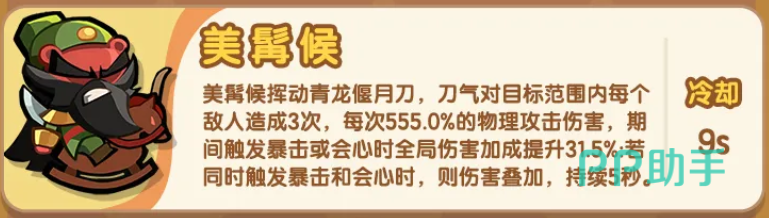 美髯侯(关公)走的是高倍率三段式爆发路线。其技能包含3次独立攻击,每次均附带555%攻击力的物理伤害,总倍率达1665%,与西壬持平。其强度跃升关键在于会心率与暴击伤害两项属性的协同激活——当二者均达到约31%的加成阈值时,三段攻击可高频触发暴击,形成伤害雪球效应。该机制使其在极限配装下拥有顶尖的瞬间清场能力,适合搭配减疗、破甲类辅助角色构建速杀体系。