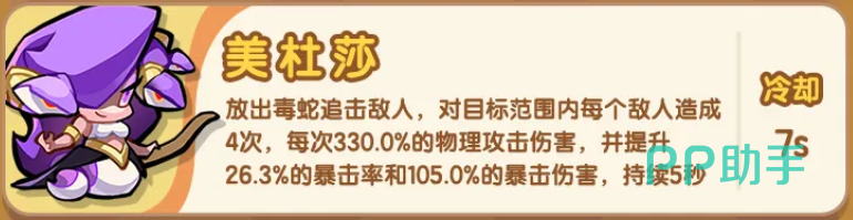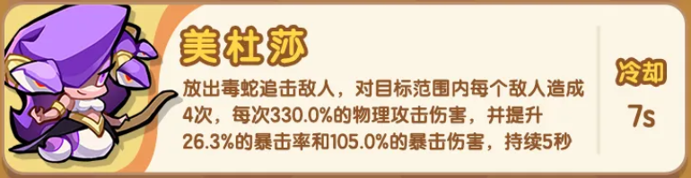 美杜莎以高频追击与毒伤叠加见长。其主动技能可触发4次连续攻击,每次造成330%攻击力的物理伤害,总计达1320%基础倍率。更重要的是,该角色成长路径高度绑定暴击率与暴击伤害两项属性——二者同步提升后,实际输出呈指数级增长。在中后期装备与符文成型阶段,其单位时间内有效伤害量稳居全角色前列,是攻坚高血量Boss与PVP压制场景中的首选核心输出。