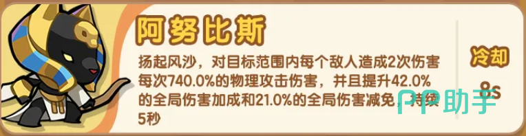 阿努比斯定位为攻守兼备的战术支点。其技能为两段式攻击,单段倍率高达740%,合计1480%。虽然总倍率略低于前三者,但其独特价值在于全局21%伤害减免效果——该减伤为常驻生效型,不依赖触发条件,可显著延长我方前排生存时间,间接提升整队输出窗口。在高难度持续伤害环境(如多阶段Boss战、塔防类玩法)中,阿努比斯的存在往往成为翻盘关键,是兼具功能性与输出潜力的复合型主力。