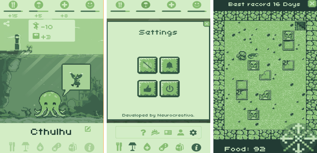 本作的玩法和规则区别于其他克苏鲁风格的手游,玩家有机会解锁各种克苏鲁怪物成为自己的宠物,与宠物一起在克苏鲁神话里冒险十分畅快,复古绿色的像素背景给人一种玩宠物机的感觉,极高代入感与灵活操作性质也是标配,全新呈现的克苏鲁世界观更让宠物爱好者耳目一新,你也尝试收养一个克苏鲁风格的小宠物吧。