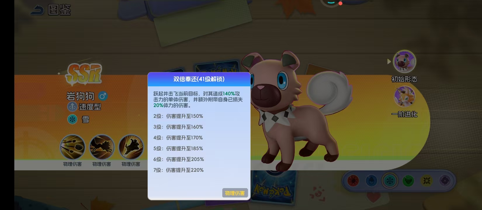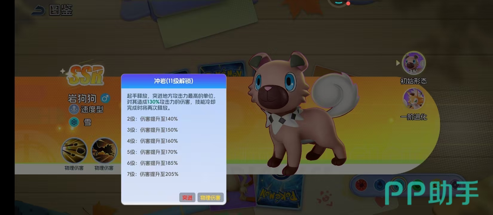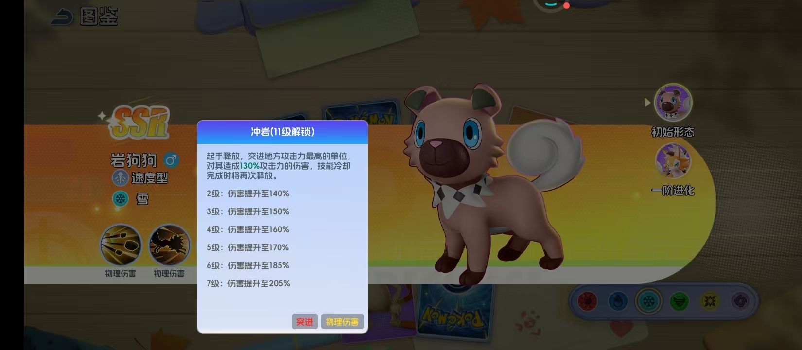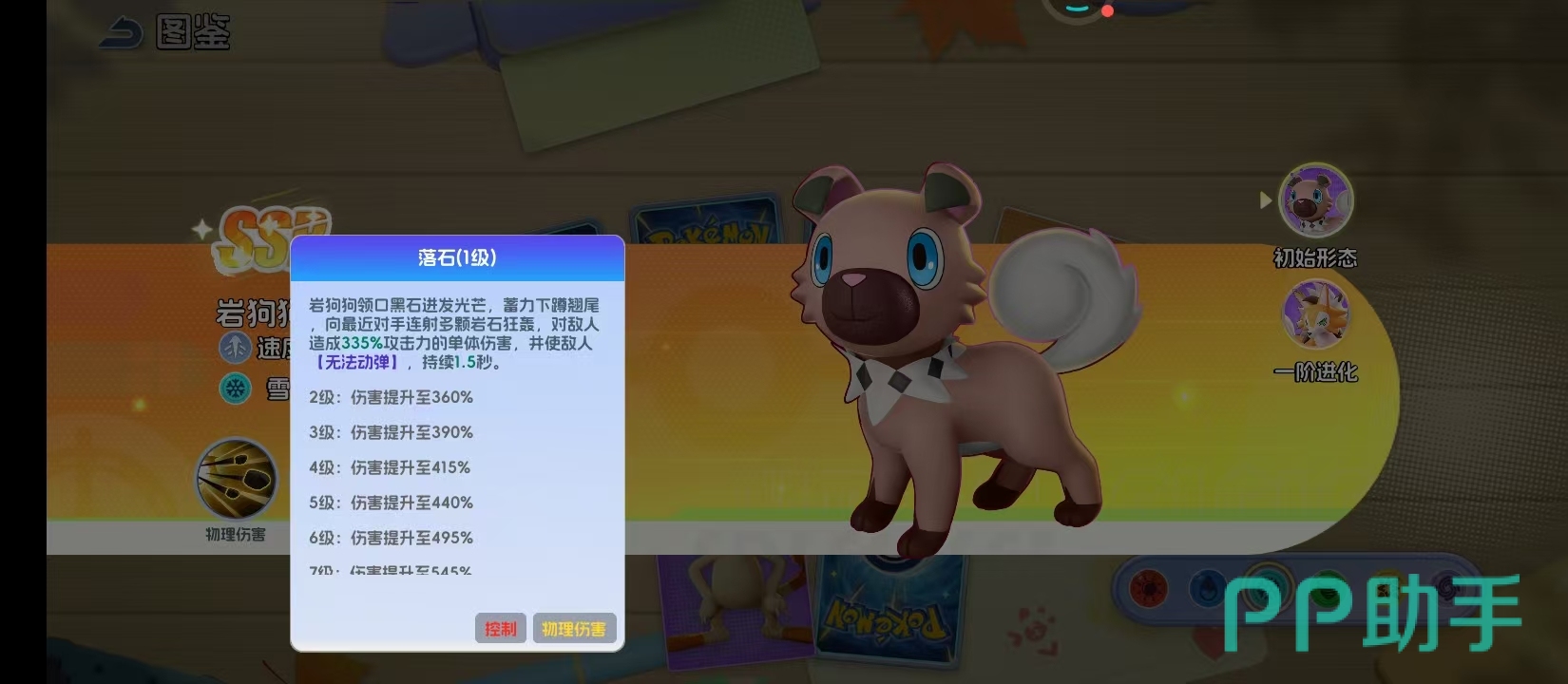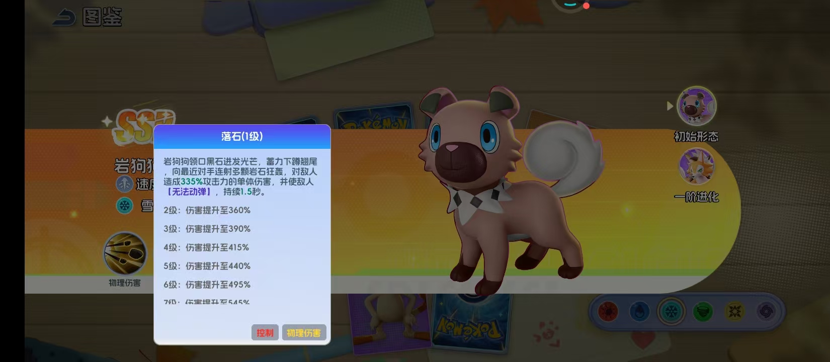 作为雪属性精灵,岩狗狗从初始形态至一级进化均延续高张力的狩猎姿态。其标志性湛蓝色瞳孔并非装饰性设定,而是与“锁定高攻目标”的AI逻辑深度绑定。核心输出技能“落石”具备双重战略价值:首回合即可发动,对敌方攻击力最高单位造成高达495%的单体伤害,并附带1.5秒强制僵直效果。该控制窗口在PVP环境中尤为关键——足以打断关键技能释放、重置敌方行动序列,为己方创造决定性转机。