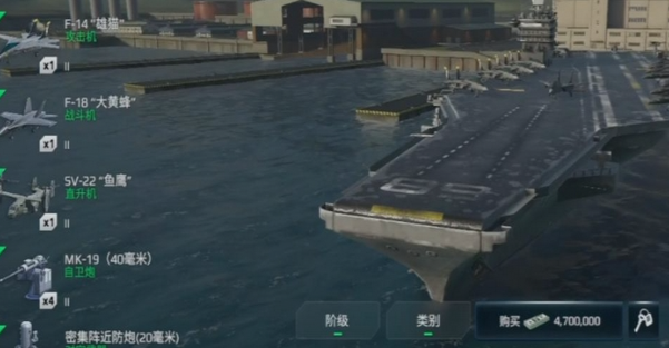 舰载装备方面,标准配置涵盖F/A-18大黄蜂战斗机与CV-22鱼鹰倾转旋翼机,兼顾对空拦截与对海突击需求;近防系统响应迅速,有效应对突发威胁,整体生存性表现稳健。购置成本为470万游戏货币,低于多数顶级航母,养成资源消耗适中,新手玩家可在较低门槛下完成完整培养路径。