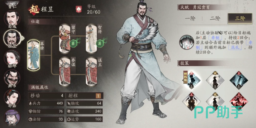 张辽2阶在命中三个或以上目标后可额外行动一次,配合辅助技能可实现单回合多次出手,战术灵活性大幅提升,3阶降低触发门槛,属于高优先级升阶目标。程昱2阶对被控制目标发动合击时可造成混乱状态,若与刘烨搭配使用,控制链更为完整。典韦与许褚升阶后的属性提升较为平庸,属于中等优先级。貂蝉2阶仅增加10点战后意保留,3阶战法增伤无明确应用场景,实战价值较低。