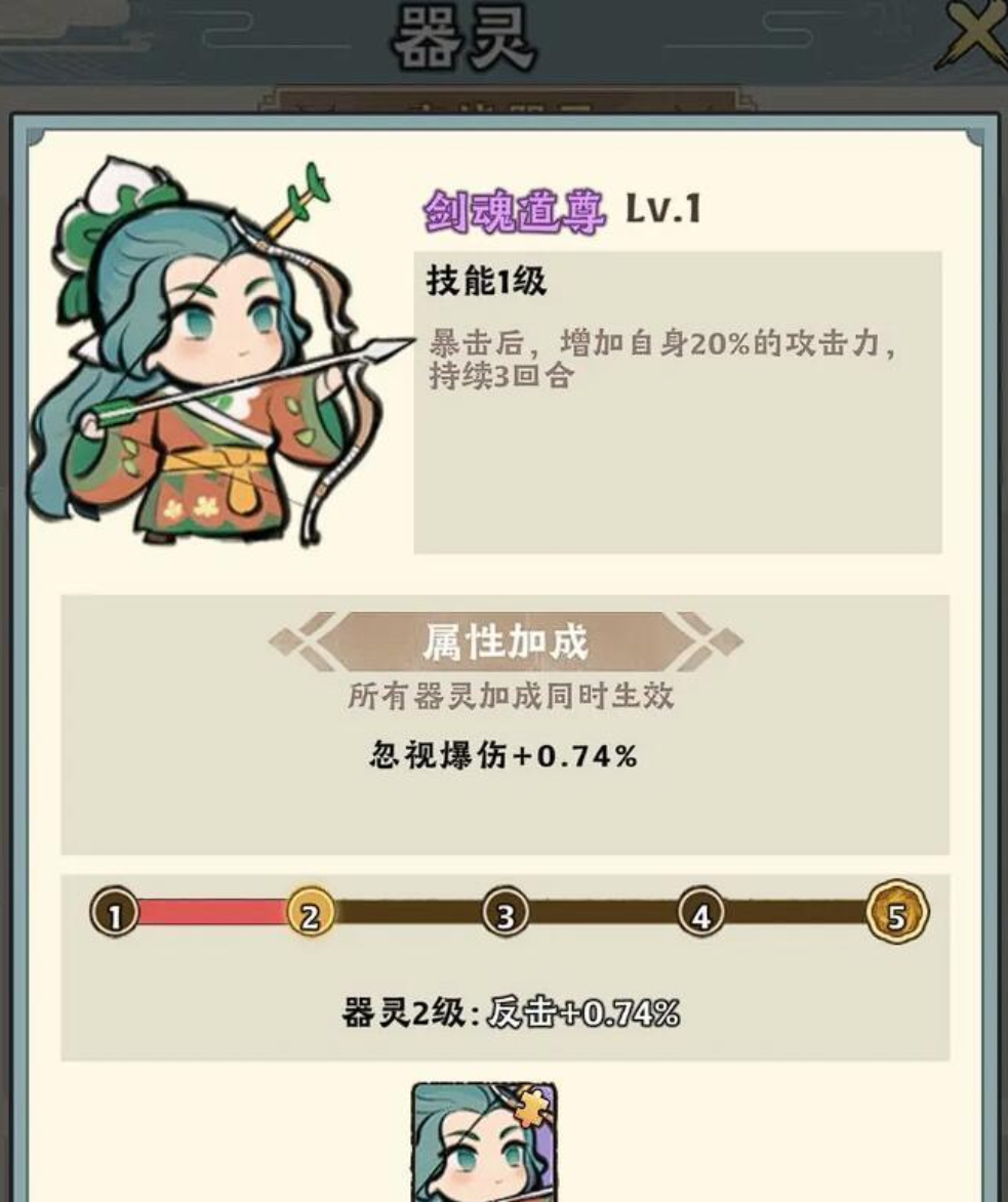 剑魂道尊属于入门级高性价比器灵,玩家仅需通关主线剧情至第五章,并顺利完成器灵觉醒任务即可获得。其外观设定为一名拉弓蓄势的小仙女形象。技能机制围绕暴击触发:每当角色造成暴击时,立即获得20%攻击力加成,持续3回合。该效果具备良好覆盖率与稳定性,特别适用于高频次、多目标的清怪场景——例如新手期的野外巡猎、悬赏任务或低阶副本扫荡,能显著缩短单场战斗时间,提升资源积累效率。