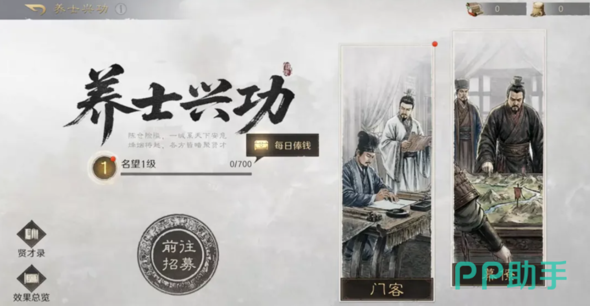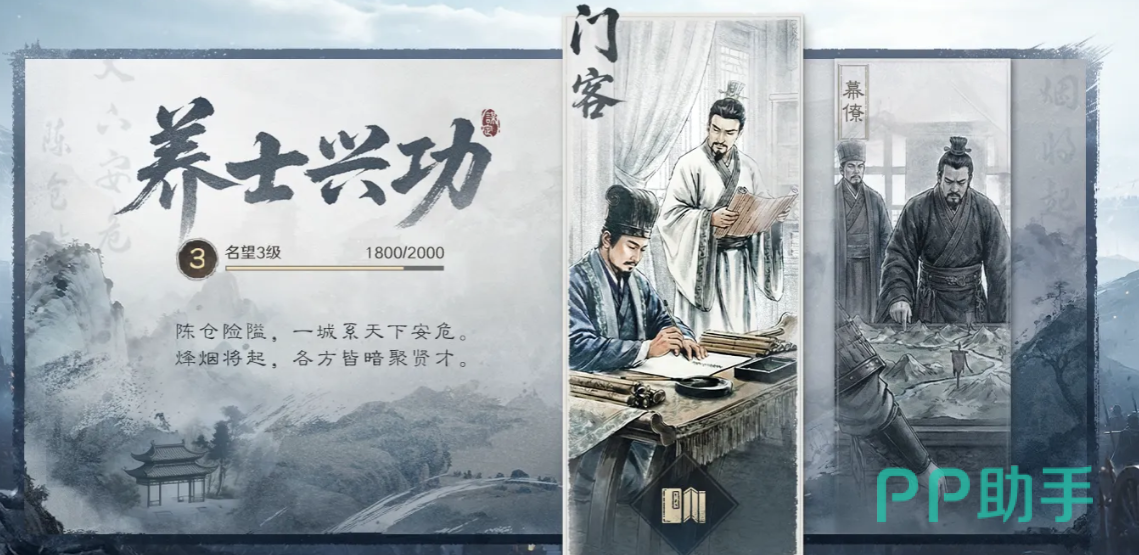 “养土兴功”由“门客”与“幕僚”两大模块构成,分别对应内政建设与军事协同两大方向。门客侧重于主城资源产出、基建效率及发育节奏调控;幕僚则聚焦于武将战法适配、兵种联动与实战表现提升。二者均随玩家名望等级逐步解锁槽位,支持动态配置与灵活调整,形成赛季专属的成长闭环。