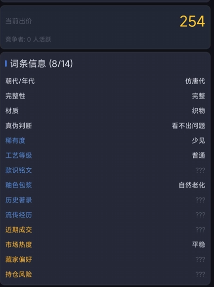 本作以古玩鉴赏与拍卖博弈为核心玩法,玩家需依据系统提供的物品词条信息,独立判断藏品真伪。判断准确可低价购入、高价转拍,实现利润积累;若误判则可能造成资金亏损,考验玩家对历史知识、材质特征及市场行情的理解能力。