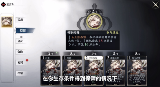 指令卡系统是索蕾尔操作深度的核心载体,五张卡各司其职,共同支撑起她的战术维度:防御(算力1)——集生存保障与狂气积累于一体,实现“守中有攻”的站场逻辑;迎客特权(算力2)——触发狂气消耗型增益的关键技能,直接决定爆发上限,是伤害跃升的核心枢纽;未被满足之痛(算力0)——零资源消耗的应急技,提供即时伤害补充与生命恢复,全场景适配性强;珠玉之卵(算力1)——专为血肉队生态设计的献祭型技能,通过主动损失生命值换取高额胚胎融合层数与续航能力,精准呼应血肉界域“以血换力”的底层规则。