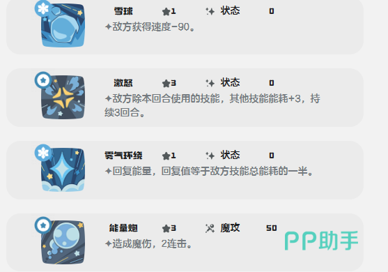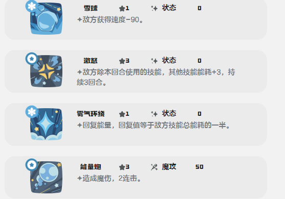 技能组设计强调资源博弈与节奏控制。“冰冻光线”为高命中魔法攻击,附带寒气效果,在造成基础伤害的同时额外增加目标技能能耗;“聒噪”则专精于加速敌方攻击类技能的消耗速度,持续削弱其输出稳定性;而核心输出技“冰封横扫”,伤害数值等同于当前敌方累计技能总能耗的10倍。这意味着当对手频繁使用技能导致能耗堆积时,此招可实现精准反制,虽无瞬杀爆发,却能层层施压、彻底打乱对方行动逻辑,是团队控场链中不可或缺的关键节点。