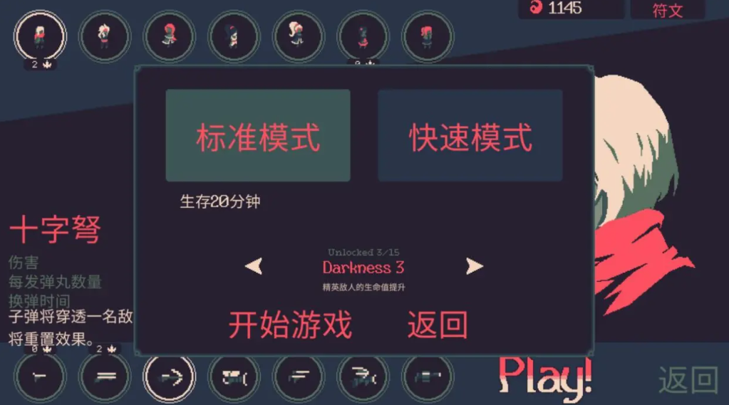 本作明确区分两种核心玩法模式:标准模式(20分钟)侧重中后期强度成长,适配需持续叠加增益的持续输出型武器;快速模式(10分钟)则强调开局爆发力,更适合依赖起手压制、但成长曲线平缓的激进流派。模式选择并非固定偏好,而是与玩家当局所选武器特性深度绑定——合理匹配模式与武器机制,是提升通关率与体验流畅度的关键决策点。