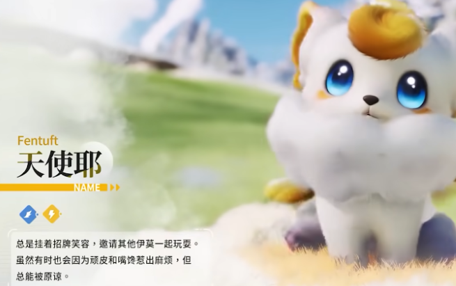 天使耶外观特征鲜明,体表覆盖蓬松柔软的云絮状毛发,行动时随肢体节奏自然飘动。其背景设定强调情绪疗愈能力——可主动调节队伍成员心理状态,并具备收集环境中散落毛发的功能,进而编织成可供休憩的坐垫。在雪麓草甸地图中,与天使耶存在深度互动关系的是另一只精灵“草原云朵羊”。后者通体覆有淡蓝色短绒,行为模式偏安静内敛,MBTI类型为INFP,与其在场景中缓步踱行、低频互动的表现高度一致。PV影像显示,二者在同屏状态下会自发靠近并触发轻度交互动画,印证其共生生态定位。