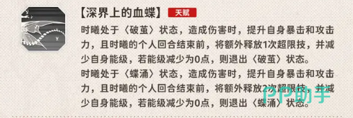 时曦的天赋技能使她在破茧状态下变得更加致命,每次造成伤害都会进一步提升她的攻击力与暴击率。而在蝶涌状态下,她不仅可以多次释放超限技,还能继续加强自身的战斗能力,增强暴击和攻击力,使她的伤害输出连绵不断。如此一来,时曦不但能为自己带来强力的输出,还能有效地打击敌人,让对方根本无法喘息。