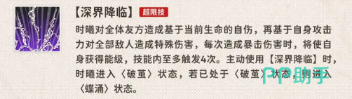然而,时曦最具特色的技能还是她的超限技。这个技能不仅对全体队友造成伤害,还能触发暴击效果,让时曦在每次暴击时获得能量。更为重要的是,超限技每次使用时,时曦都会进入破茧状态,而当她已经处于破茧时,则会进入更高阶段的蝶涌状态。这种状态的转变,赋予了她强大的输出与生存能力,让敌人防不胜防。