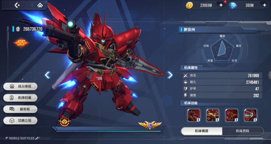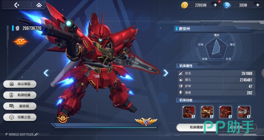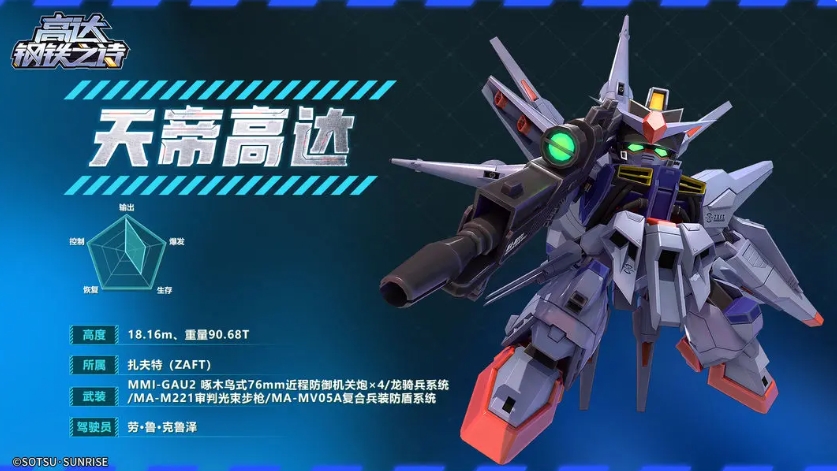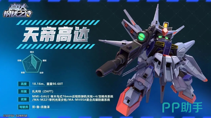新安洲高达具有出色的战术压制能力,其装备的火箭炮威力巨大,能够穿透3.2米厚的装甲,并且可以将35%的伤害转化为自愈,这提高了其在战场上的生存能力,同时技能4推进器超载能够提升攻击与闪避属性,使其在中远程火力压制方面表现出色,无论是在进攻还是防御端,新安洲高达都能够发挥作用,为团队提供稳定的火力支援。